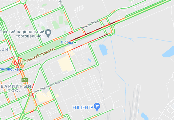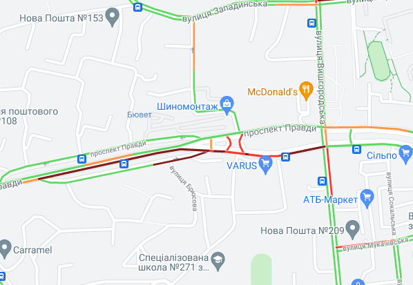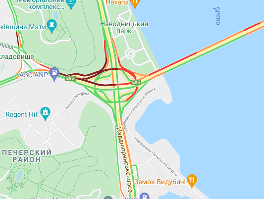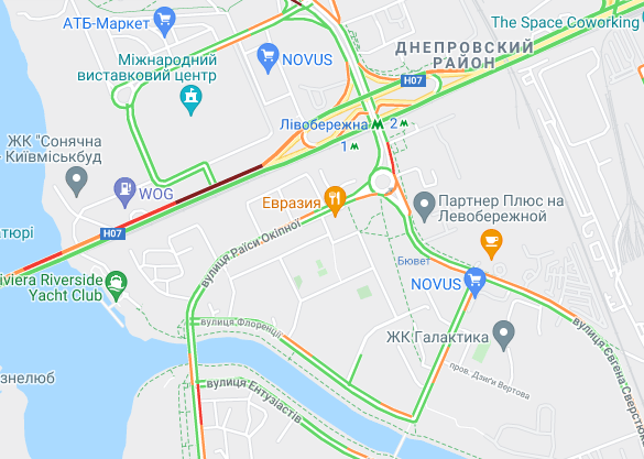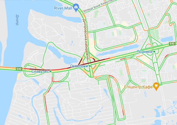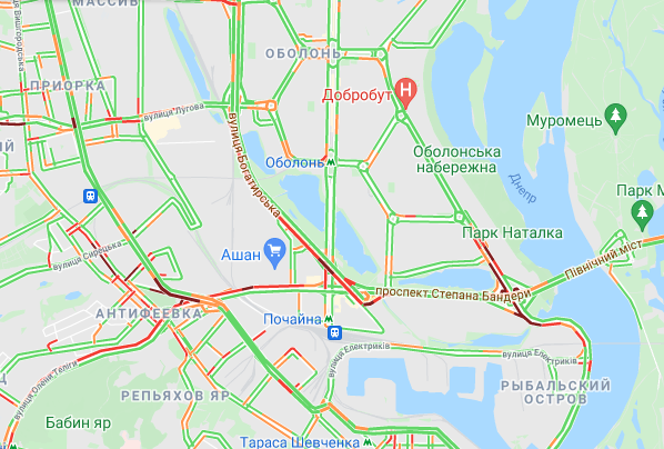 Ускладнено рух авто на Броварському проспекті (між Русанівським мостом і станцією метро "Лівобережна"). "Тягучка" утворилися на проспекті Соборності, ближче до ринку "Березняки". Важко проїхати по проспекту Миколи Бажана, біля станцій метро "Славутич" і "Осокорки".