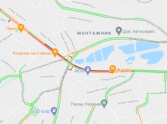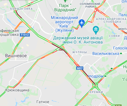 Пробки утворилися по Кільцевій дорозі. Водій стоять в заторі на вулиці Вадима Гетьмана (від вул. Борщагівська до вул. Уманська) і на проспекті Валерія Лобановського. Автомобілям важко проїхати біля станцій метро "Житомирська", "Святошин" і "Берестейякая". Утворилися затори на проспекті Степана Бандери (біля Куренівського парку), вул. Богатирська і на проспекті Правди.