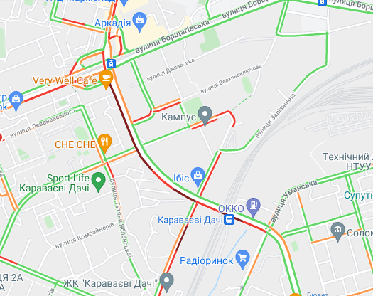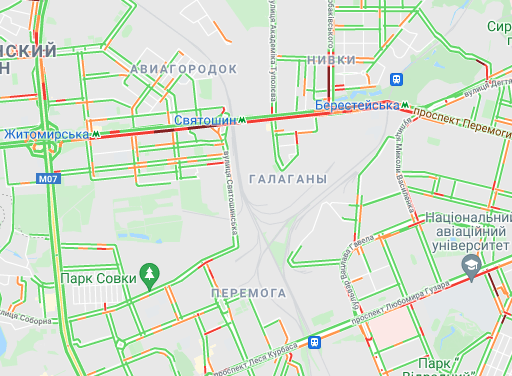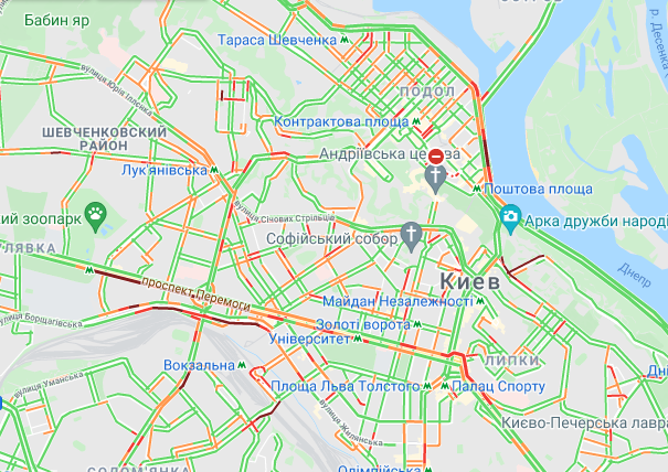 Авто стоять в заторі на проспекті Перемоги (від ст. метро "Політех" до станції метро "Університет"). Важко проїхати по вулиці Жилянська. Ускладнено рух автомобілів на Набережно-Хрещатицькій і бульварі Дружби народів.
