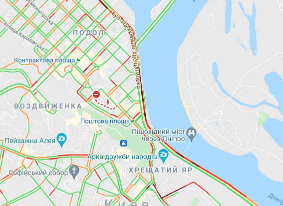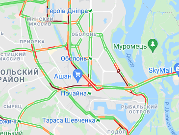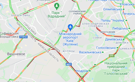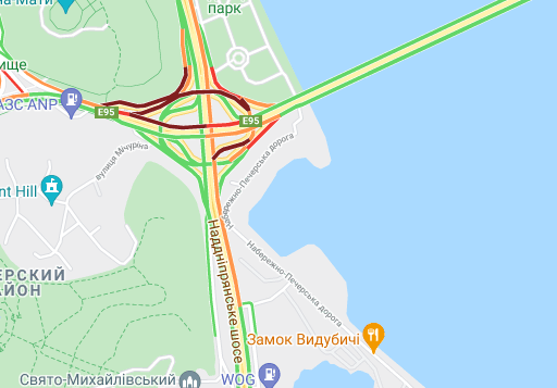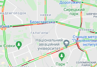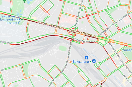 Пробки утворилися по Кільцевій дорозі. Варто вулиця Вадима Гетьмана (від вул. Борщагівська до вул. Уманська), вул. Щусєва, проспекті Валерія Лобановського. Спостерігаються пробки на проспекті Степана Бандери, вул. Олени Теліги, вул. Семена Скляренка, вул. Куренівська, а також біля станції метро "Героїв Дніпра".