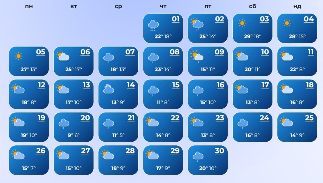 Наприклад, 7 вересня очікують на похолодання до 18 градусів, 8 вересня повітря прогріється до 22 градусів Цельсія, 9 вересня знову різке падіння до 15 градусів, а 10 вересня температура підніметься до 20 градусів.