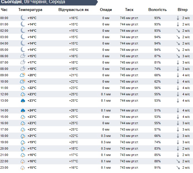 У Києві в середу, 9 червня, очікуються зливи і гроза, які триватимуть до глибокої ночі.
