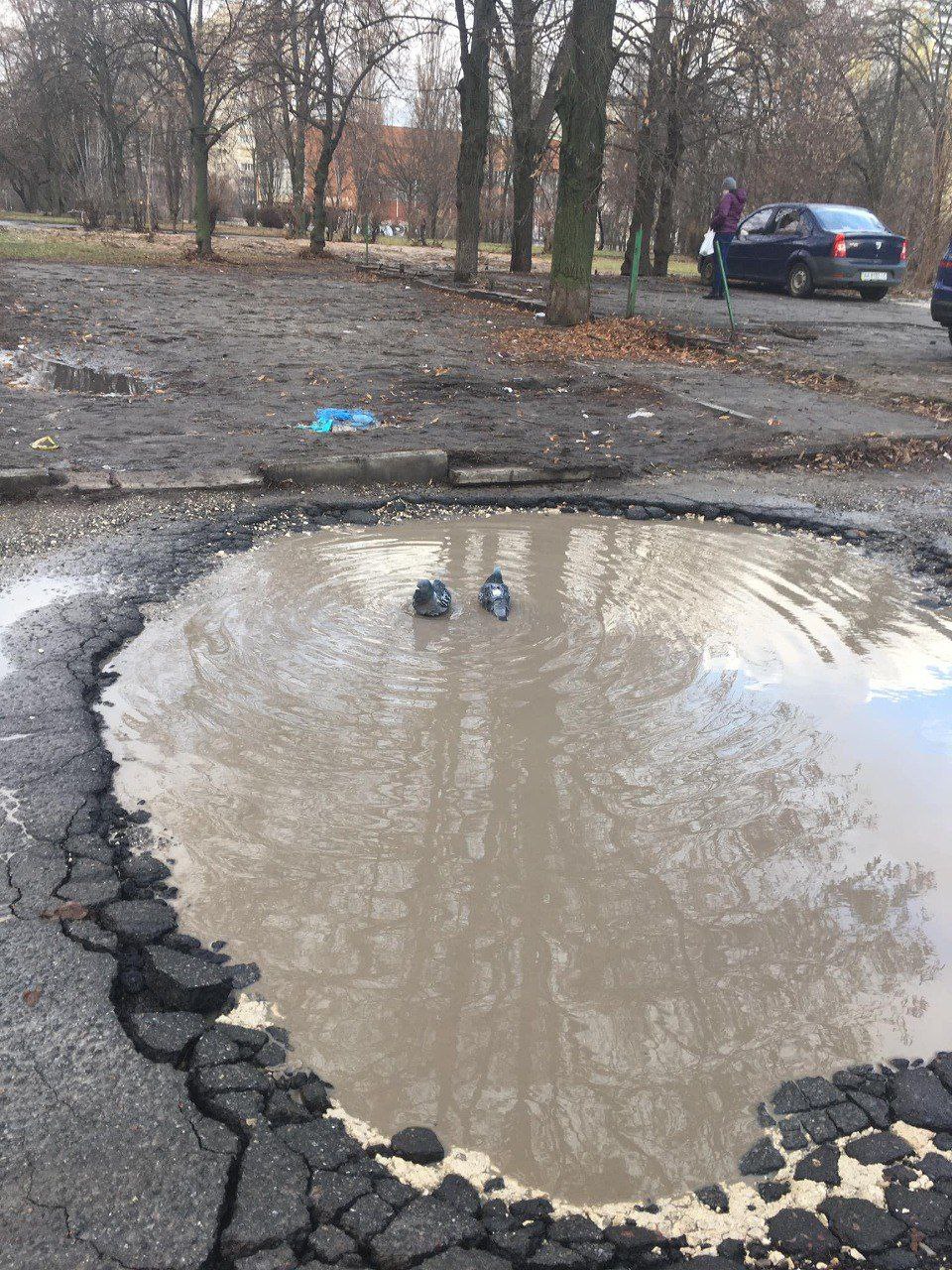 У парку "Орлятко" провалилося асфальтове покриття. Коли розтанув сніг, яма перетворилася на "озеро" і привернула увагу птахів, які перетворили її на свою "купальню". Місцеві мешканці скаржаться на пошкоджене покриття та відсутність будь-яких робіт для виправлення ситуації. Неясно, якою глибиною ця яма.