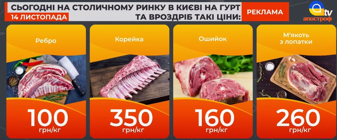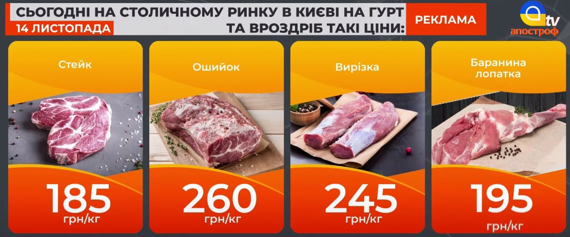 Зокрема, на лопатку свинячу ціна 175 грн за кг, за м'якоть задньої частини продавці просять 180 грн, ребро і биток – за 195 грн.
