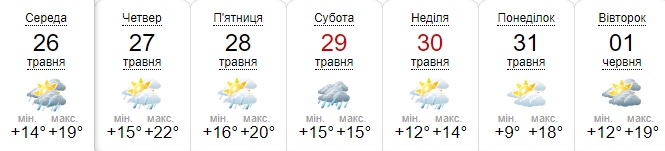 У середу, 26 травня, незважаючи на ясну ніч, ранок у Києві не буде безхмарним. Хмари займуть своє місце під сонцем і не залишать його до самого вечора. З самого ранку буде йти дощ. Вдень він може ослабнути, але до вечора знову набере силу. В цей день очікується град діаметром 6-19 мм, гроза, а також короткочасне шквальне посилення вітру до 15-24 м / с