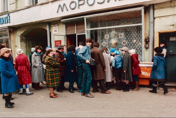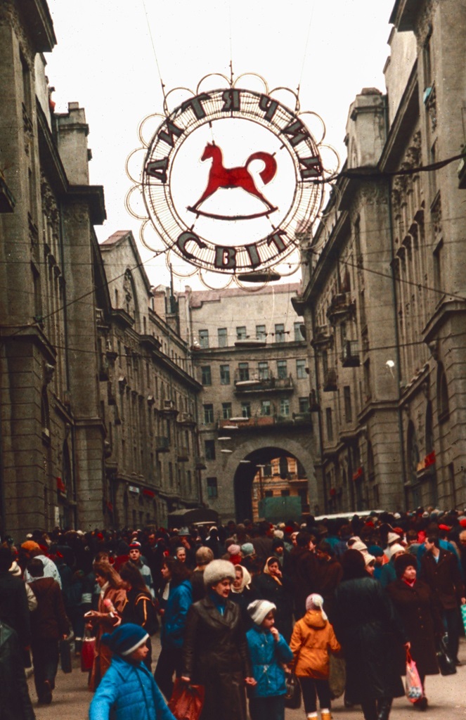 Хрещатик у 1980-х був переповнений громадським і приватним транспортом, а до центрального гастроному, як і ЦУМу стояли величезні черги за дефіцитними товарами.