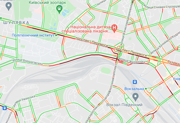 Авто стоять в невеликих пробках на проспекті Перемоги (від ст. М. "Політехнічний інститут" до вул. Бульварно-Кудрявська). Важко рухатися вулицею. Жилянська. Затори утворили на бульварі Дружби народів і Набережному шосе.