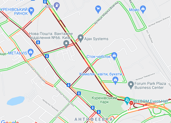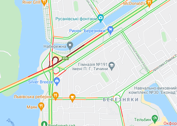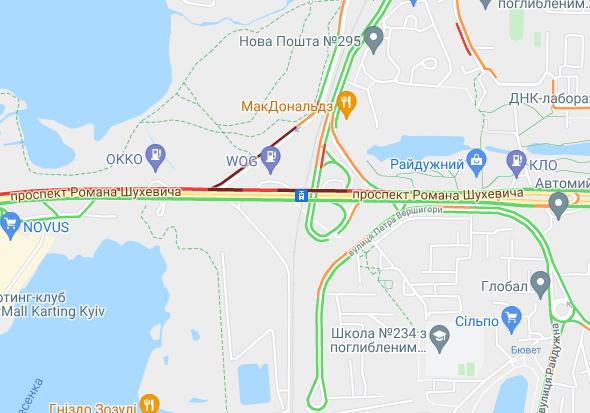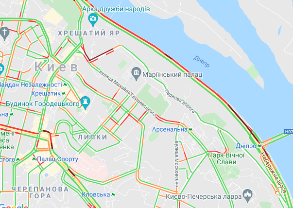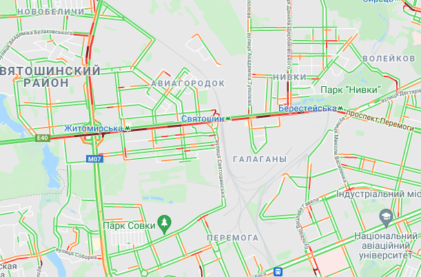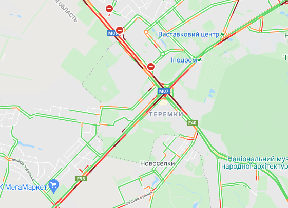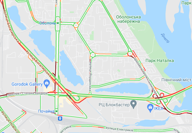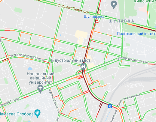 Пробки утворилися по Кільцевій дорозі, ближче до Іподрому. "Варто" вулиця Вадима Гетьмана (від вул. Уманська до станції метро "Шулявська"). Утворилися затори на вул. Семена Скляренка, вул. Куренівська, вул. Кирилівська, вул. Богатирська. Ускладнено рух по Набережному шосе і Наберережено-Хрещатицькій. Ускладнено рух біля станцій метро "Берестейська", "Житомирська" та "Святошин".