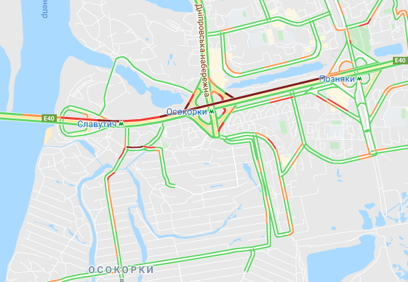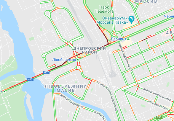 Невеликі пробки утворилася на проспекті Романа Шухевича і вул. Оноре де Бальзака. Важко проїхати по проспекту Соборності (біля ринку Березняки), біля станцій метро "Лівобережна" і "Дарниця". "Стоять" авто по проспекту Миколи Бажана, між станціями метро "Осокорки", "Позняки" і "Славутич".