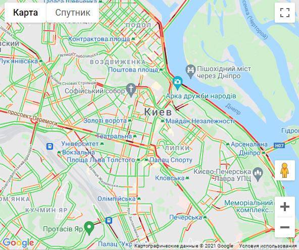 Судячи з опублікованих карт пробок, проблеми з рухом виникли на всіх мостах через Дніпро. Також "стоять" Набережне шосе і Набережно-Хрещатицька вулиця.