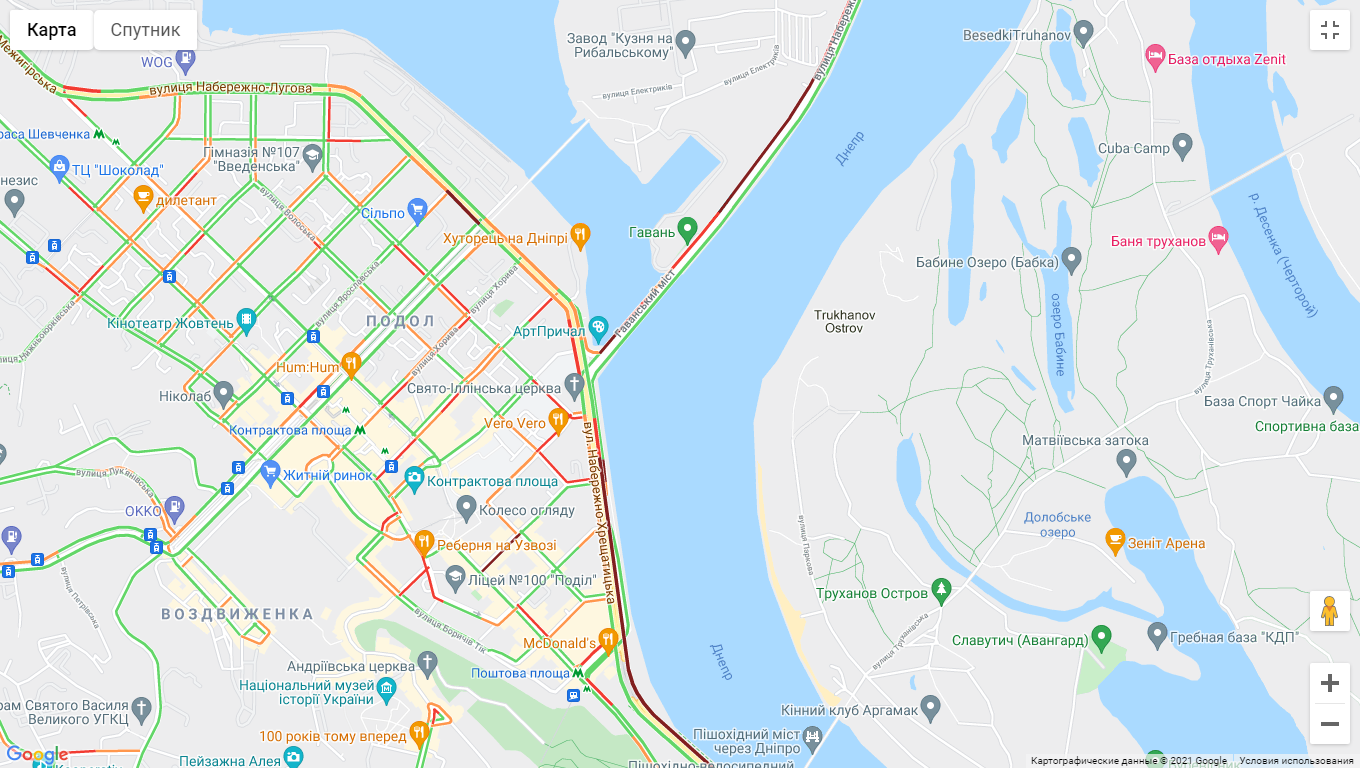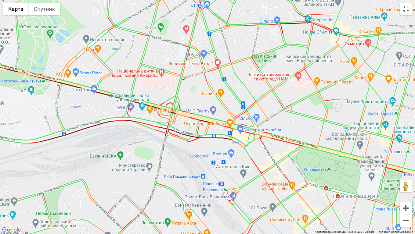 Авто стоять в заторі на проспекті Перемоги (від ст. Метро "Політех" до ст. Метро "Палац Спорту"). Ускладнено рух транспорту на вул. Жилянська. Затори утворилися на Наддніпрянському шосе, бульварі Дружби народів і Набережно-Хрещатицькій (в районі ст. метро "Контрактова площа").