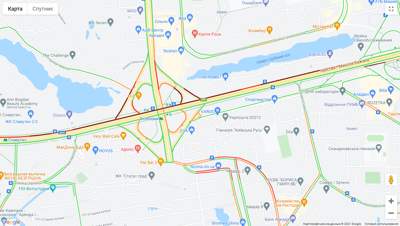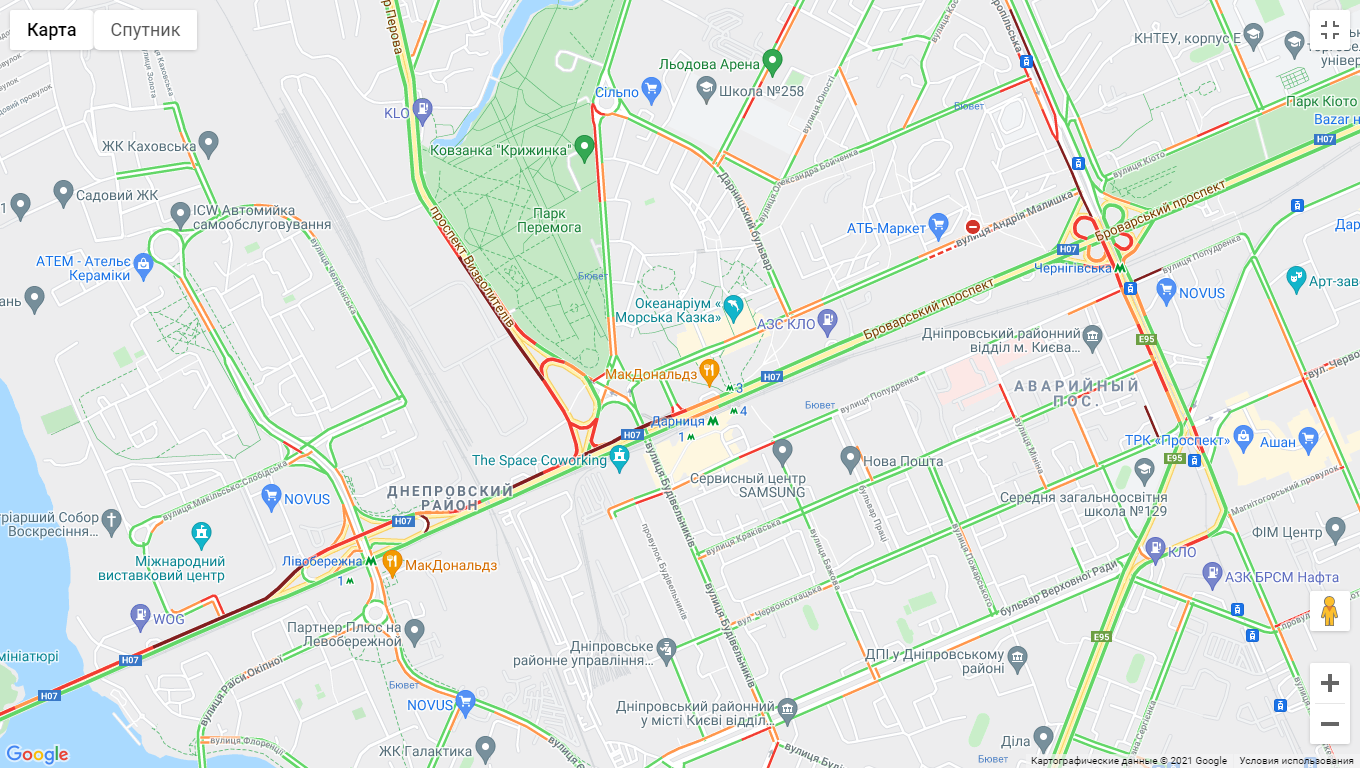 Ускладнено рух авто на Броварському проспекті (біля станцій метро "Дарниця" та поблизу Русанівського моста). "Тягучка" утворилися біля парку Перемоги на проспекті Визволителів і на проспекті Соборності (біля ринку "Березняки" та поблизу моста Патона). Важко проїхати по проспекту Миколи Бажана, біля станцій метро "Позняки" і "Осокорки". Автомобілі "стоять" у ст. метро "Боріспільська" по вул. Світлої.