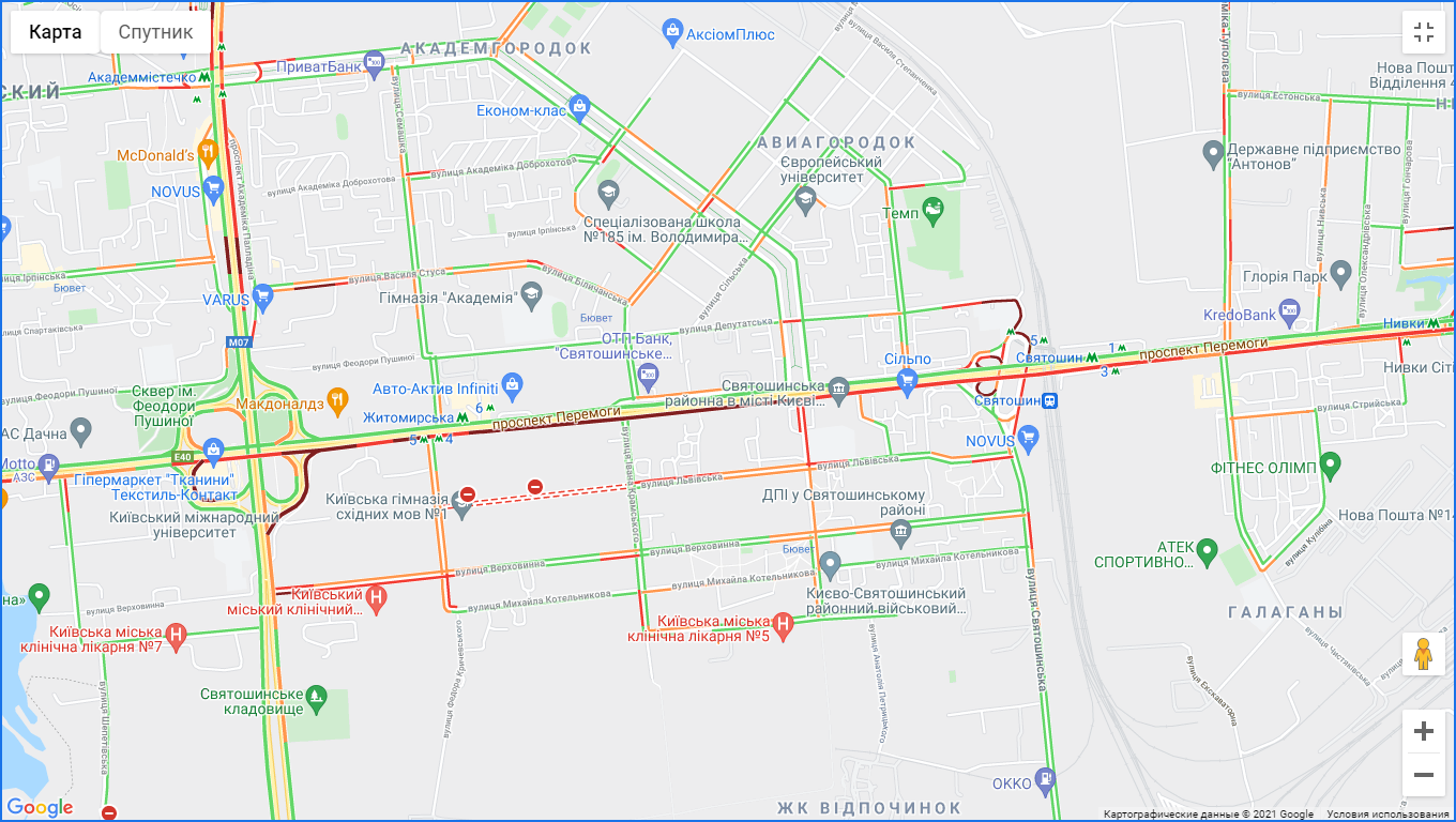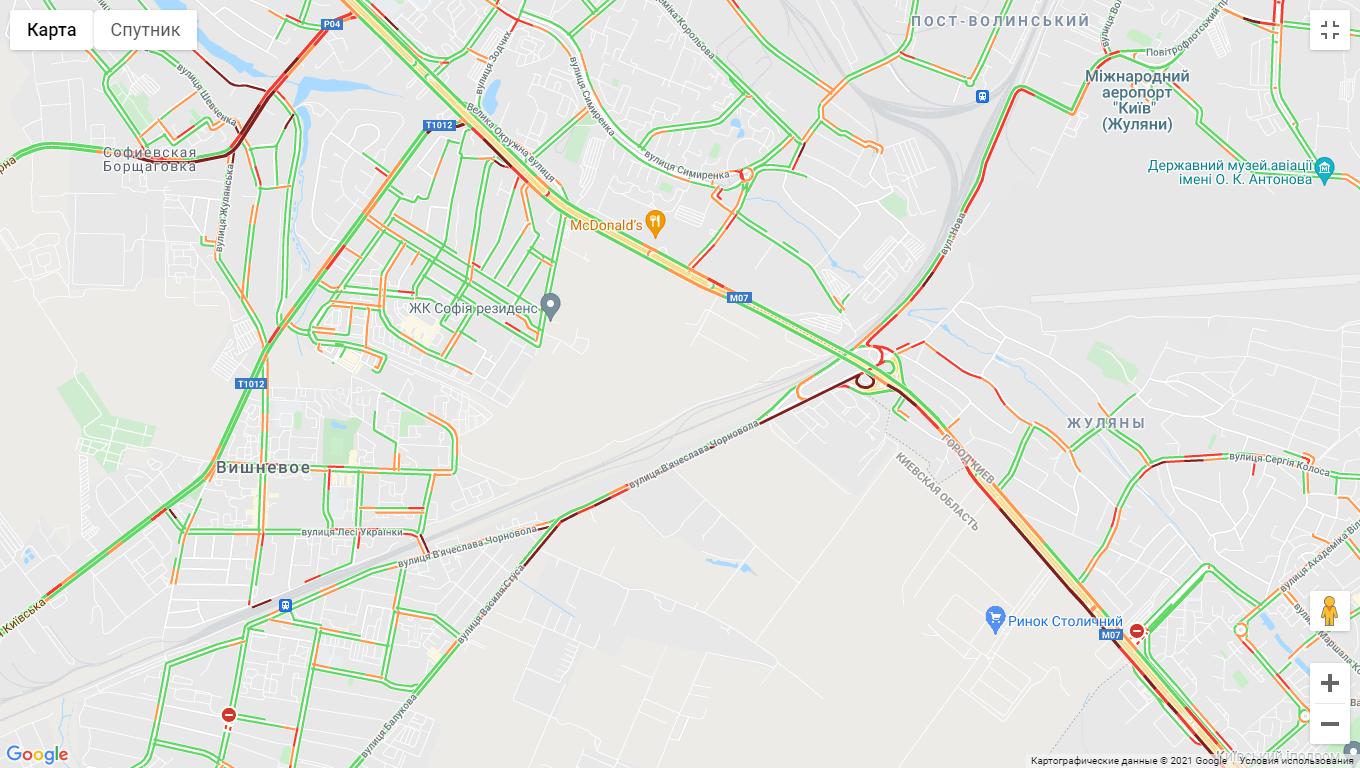 Від станції метро "Термкі" по Кільцевій дорозі стоїть рух, як і по вулиці В'ячеслава Чорновола неподалік. Пробки утворилися на вул. Київська (Вишневе), Соборна (Софіївська Борщагівка). "Варто" вулиця Вадима Гетьмана (від ост. Караваєві Дачі до вул. Алекси Тихого). "Тягучка" утворилася на вул. Авіаконструктора Сікорського (біля парку "Нивки") і вул. Щербаківського (Нивки). Затори спостерігаються у метро "Берестейська", "Святошин" і "Житомирська". Великі пробки на проспектах Лобановського і Голосіївському.