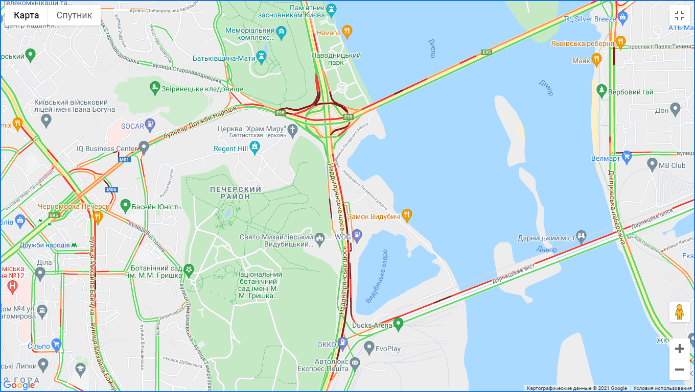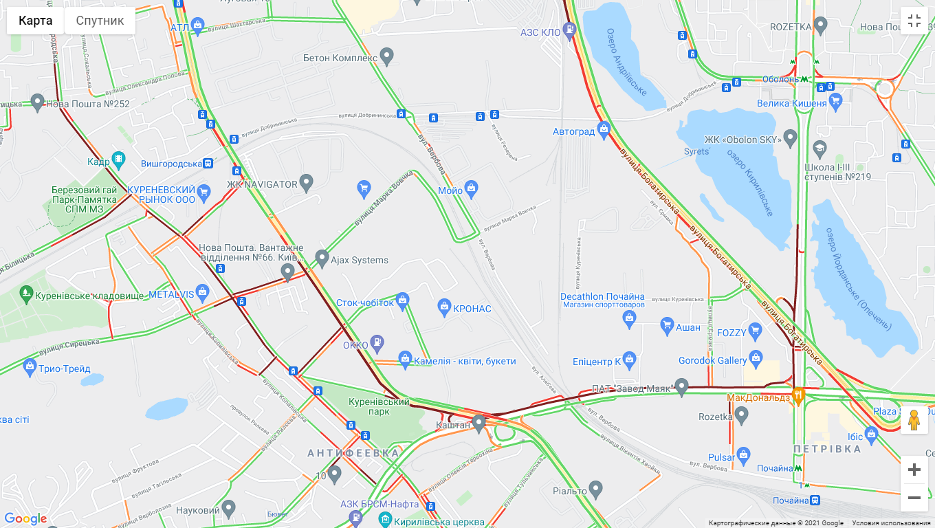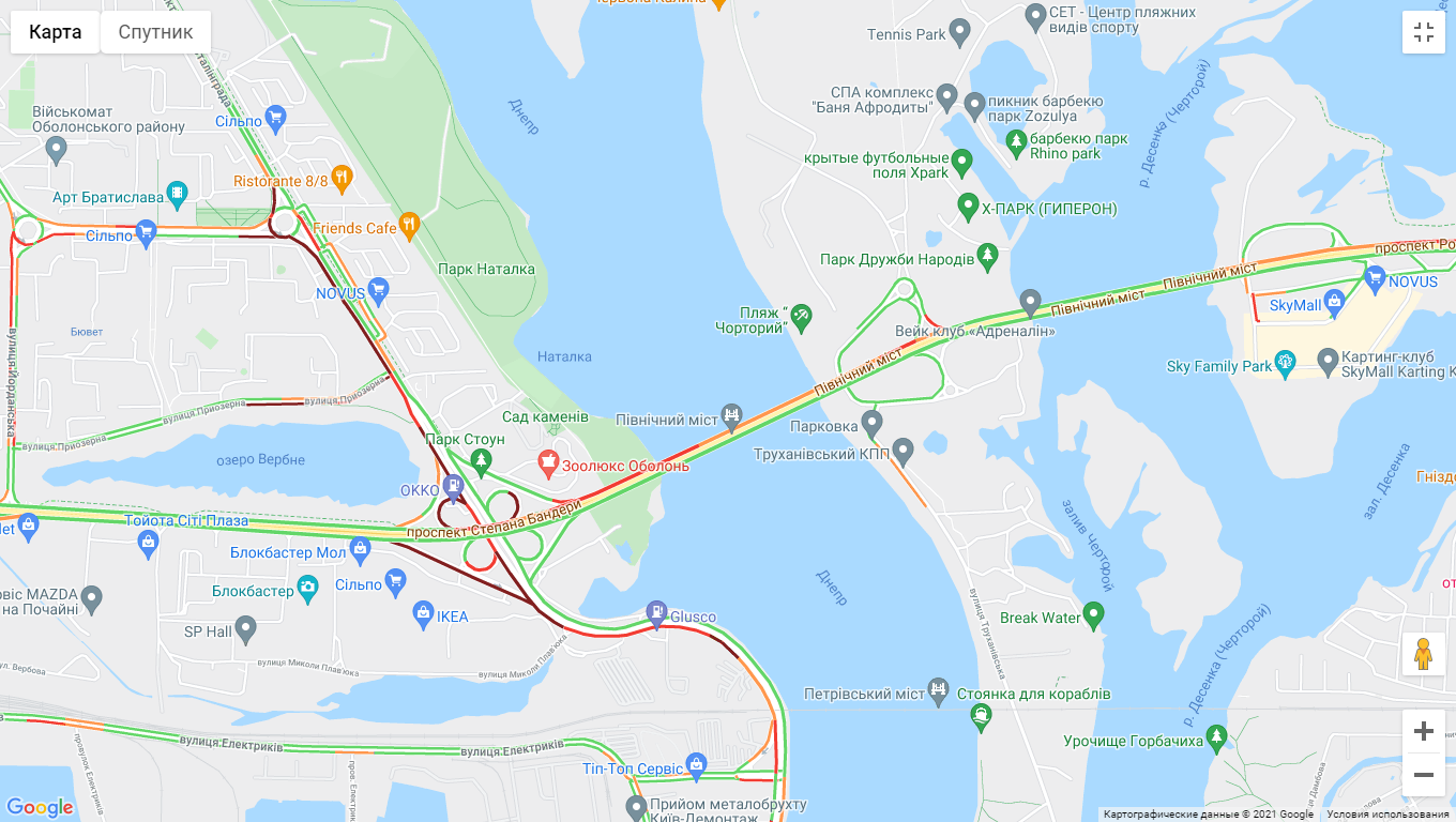 Утворилися затори на проспекті Степана Бандери, вул. Куренівська, вул. Щусєва, вул. Кирилівська, вул. Вишгородська, вул. Богатирська, вул. Семена Скляренка (біля Куренівського парку), вул. Полярна (поблизу озера Опечень).