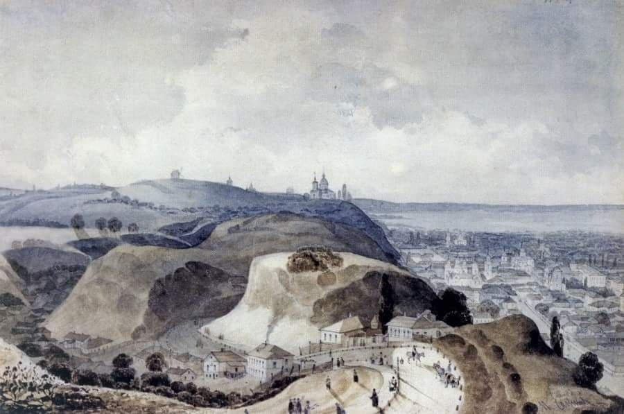 На малюнку, написаному аквареллю, зображений Андріївський узвіз, Замкова гора та Щекавиця. На горі будинків ще немає, лише церква та млин.