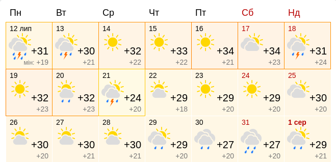 У столиці до початку серпня денна температура лише одного разу опуститься нижче +29 градусів, а з 12 липня на киян чекає нова хвиля спеки. Стовпчики термометрів підніматимуться до + 32 ... + 34 градусів вдень, а вночі - опускатися до + 20 ... + 23 градусів.