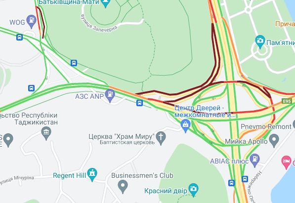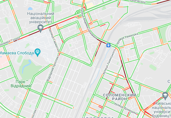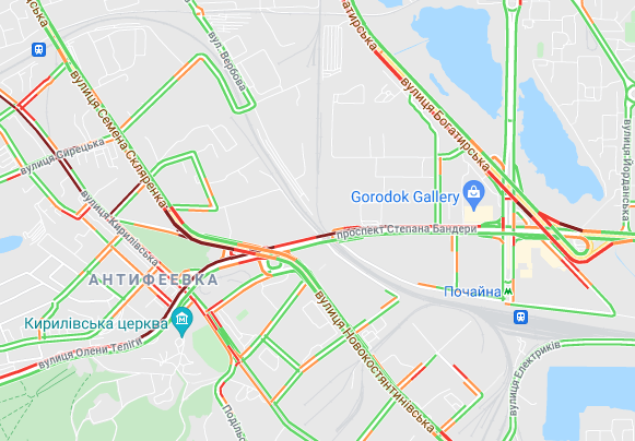 За Кільцевій дорозі утруднено рух. "Стоять" авто на вулиці Вадима Гетьмана (в районі вул. Польова), на Чоколівському бульварі та на проспекті Леся Курбаса. Утворилися затори на вул. Богатирська, вул. Семена Скляренка (біля Куренівського парку) і на проспекті Степана Бандери.