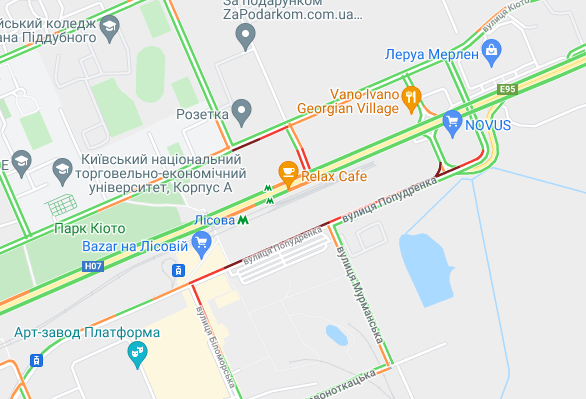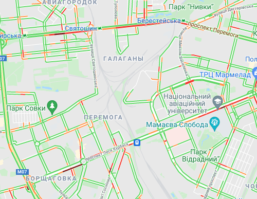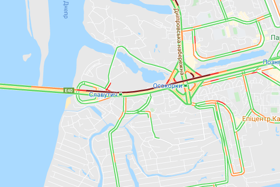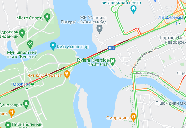 Невеликі пробки утворилася біля станції метро "Лісова", а також на Русанівському мосту і біля ринку "Березняки". "Стоять" авто по проспекту Миколи Бажана, між станціями метро "Осокорки" і "Славутич".