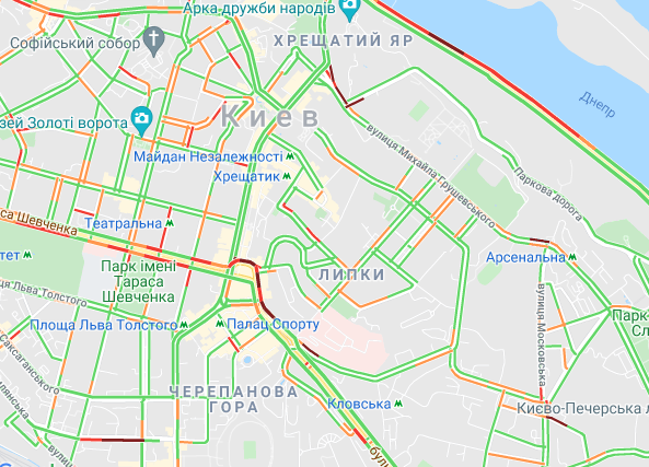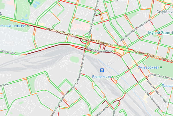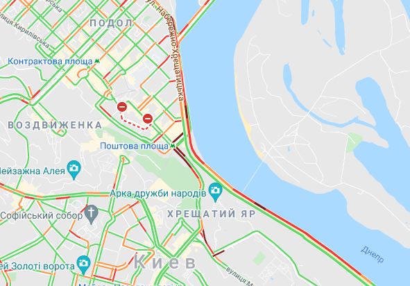 Ускладнено рух транспорту на вул. Жилянська і на проспекті Перемоги (від станції метро "Політех" до вул. Бульварно-Кудрявська). Затори утворилися біля Бессарабського ринку, а також на вул. Набережно-Хрещатицька і у станції метро "Поштова площа". Важко проїхати на бульварі Дружби народів.