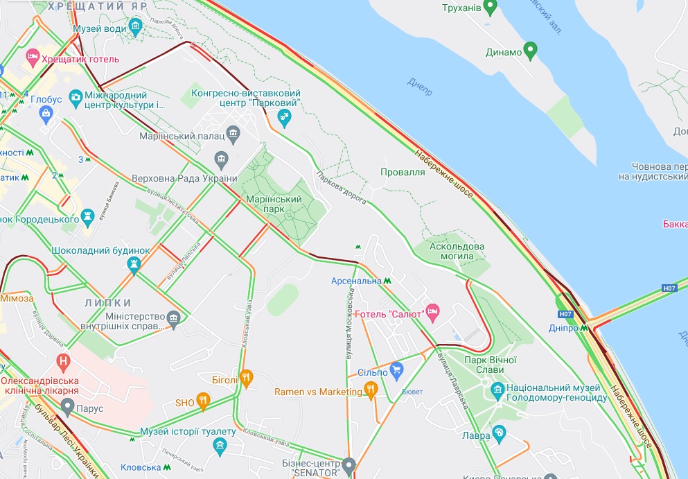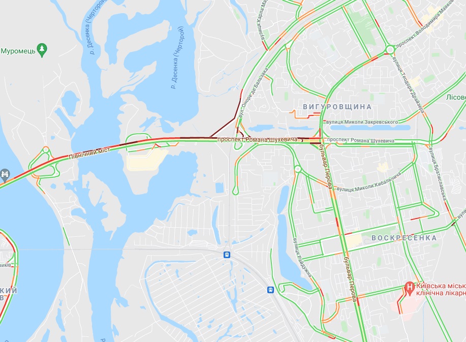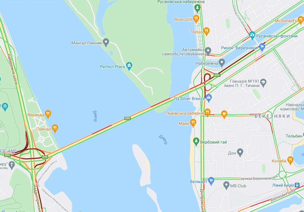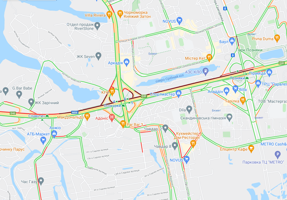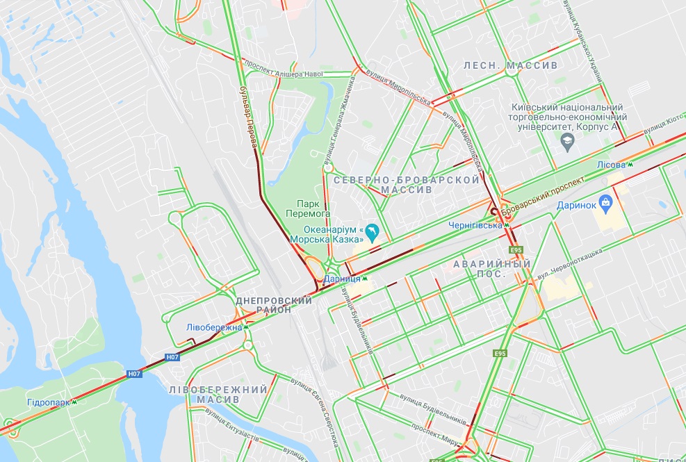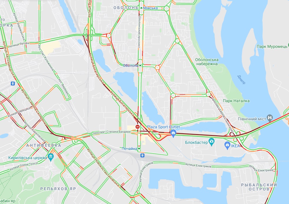 Утворилися затори на проспекті Степана Бандери, вул. Семена Скляренка, вул. Богатирська, вул. Куренівська. Ускладнено рух на бульварі Дружби народів.