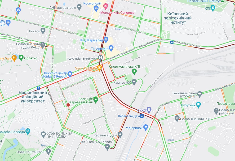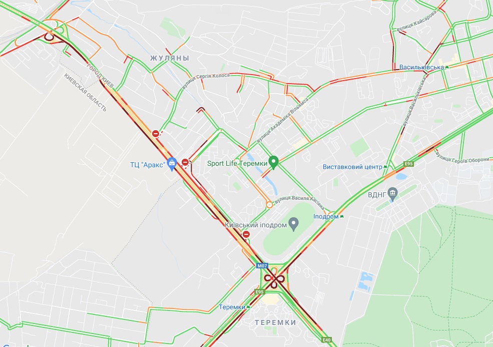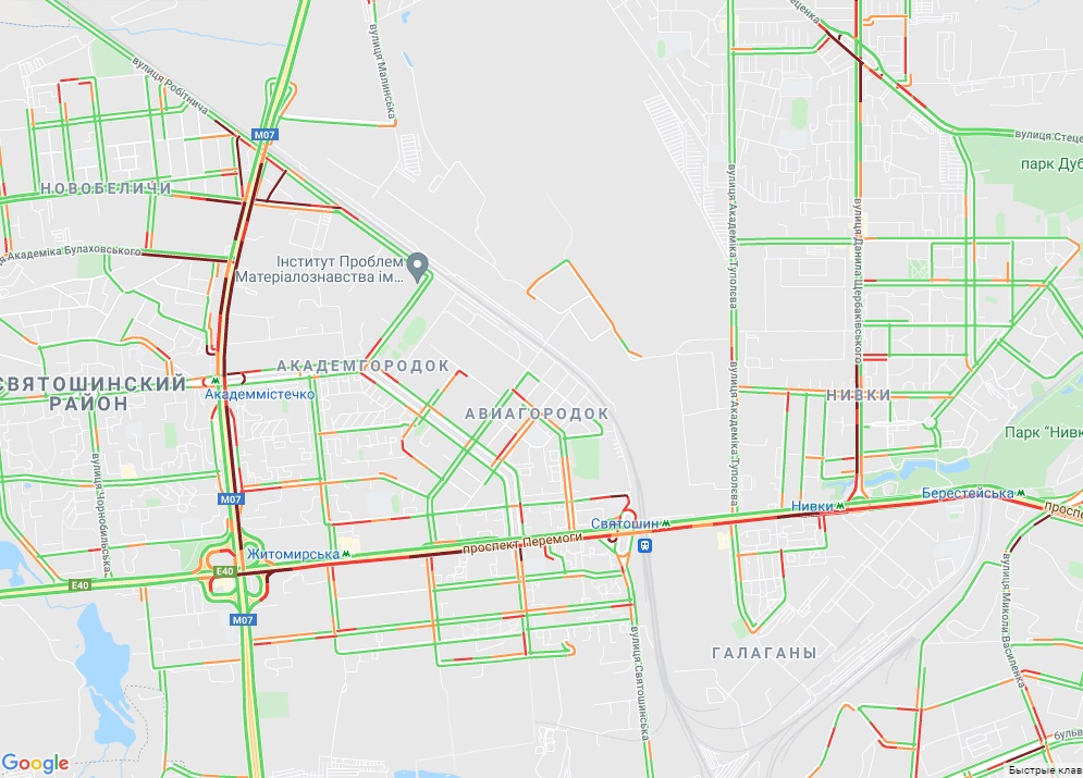 Пробки утворилися по Кільцевій дорозі (від ст. Метро "Теремки"). "Стоять" вулиця Вадима Гетьмана (до Шулявського моста), проспект Любомира Гузара (у бік Індустріального моста), проспект Лобановського. Автомобілям важко проїхати біля станцій метро "Житомирська", "Святошин", а також по вул. Щусєва.