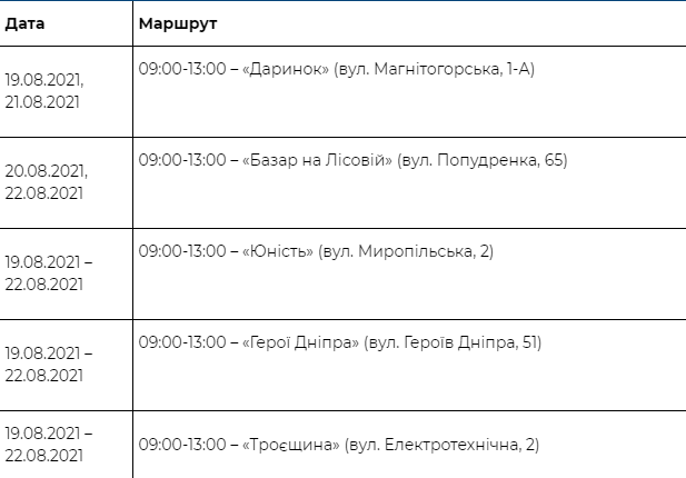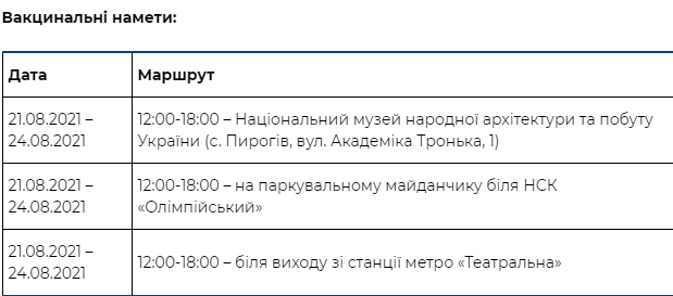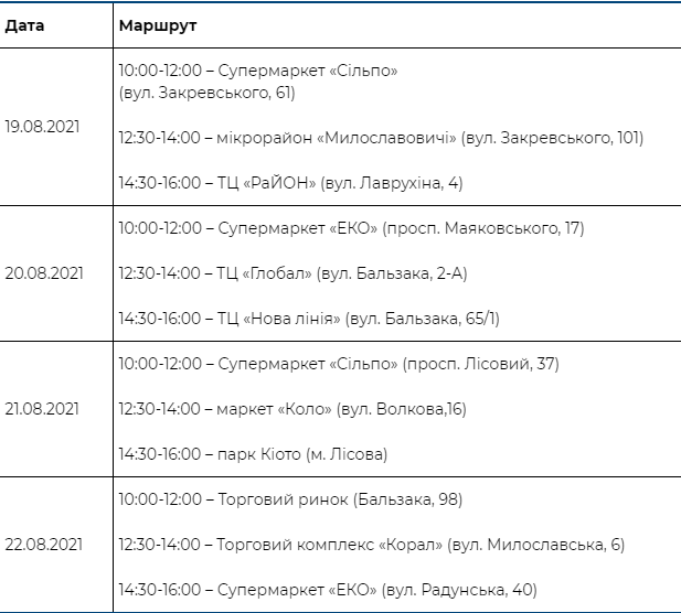 З 19 по 24 серпня в місті курсуватимуть автобуси за заздалегідь визначеним графіком, де може щепитися будь-який громадянин України або особа, що має постійну посвідку на проживання. Для отримання вакцини в мобільному пунті попередній запис не потрібний. Бажаючі мають надати паспорт, ІНН та мобільний телефон.