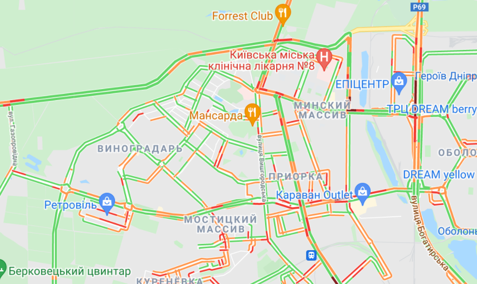 Як повідомляють місцеві жителі, щільний трафік спостерігається по Кільцевій дорозі, на ділянці між Мінським шосе та Богатирською. Там у пробці зупинилися кілька десятків авто, зокрема великогабаритних. За словами місцевих, краще об'їжджати цю ділянку дороги.