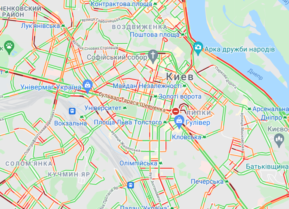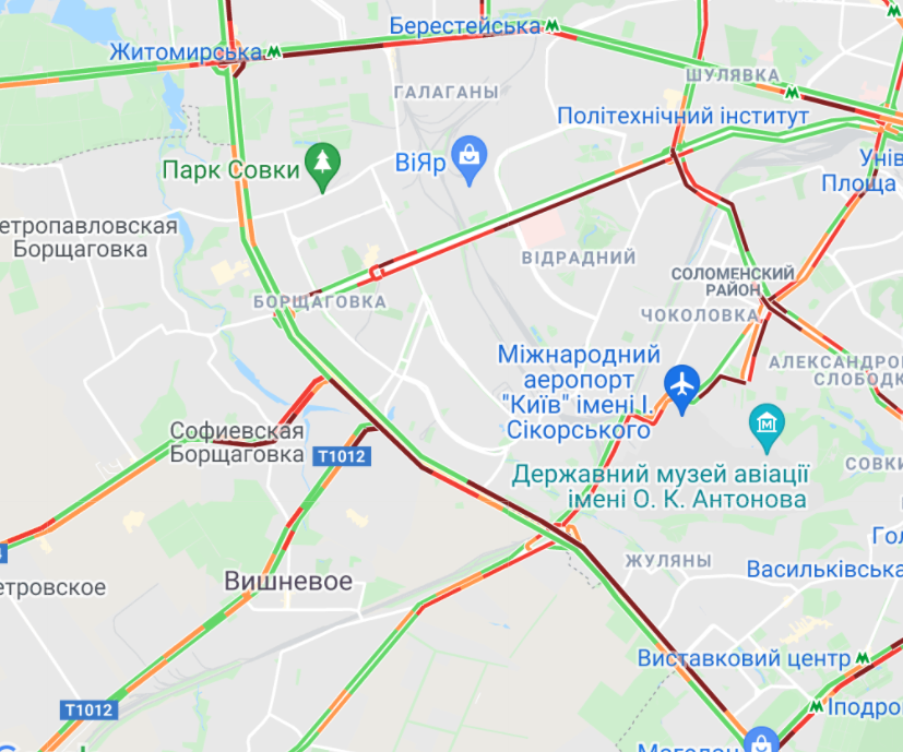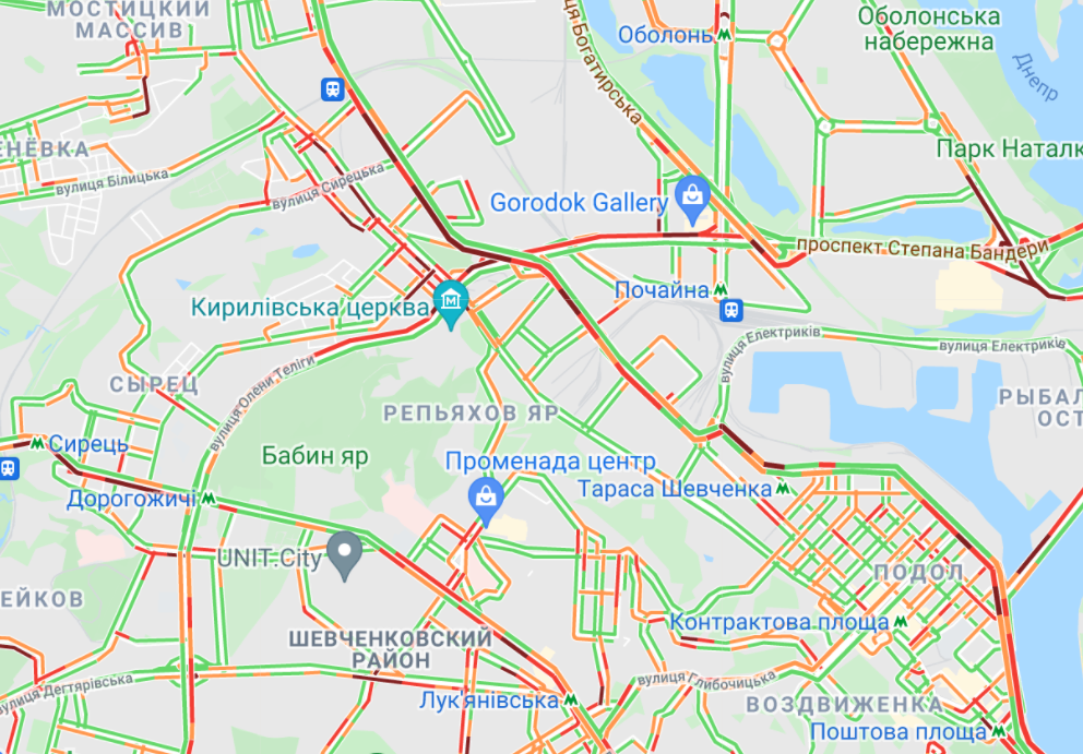 Великі пробки утворилися на Кільцевій дорозі та проспекті Любомира Гузара (у бік центру). Важко проїхати вул. Вадима Гетьмана та Севастопольською площею. Трохи утруднений рух на проспекті Бандери, вул. Вишгородська, проспект Героїв Сталінграда, вул. Семена Скларенка, а також на Набережно-Рибальській. Водії стоять у пробці від станції метро "Житомирська" до "Берестейської".