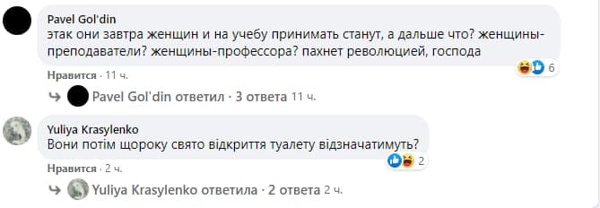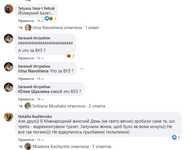 У Києві в одному з університетів керівництво вирішило зробити подарунок жінкам до 8 березня - там помпезно відкрили відремонтований жіночий туалет. Захід супроводжувався виступом ректора, урочистим перерізанням стрічки і бурхливими оплесками.