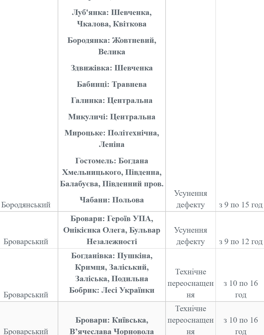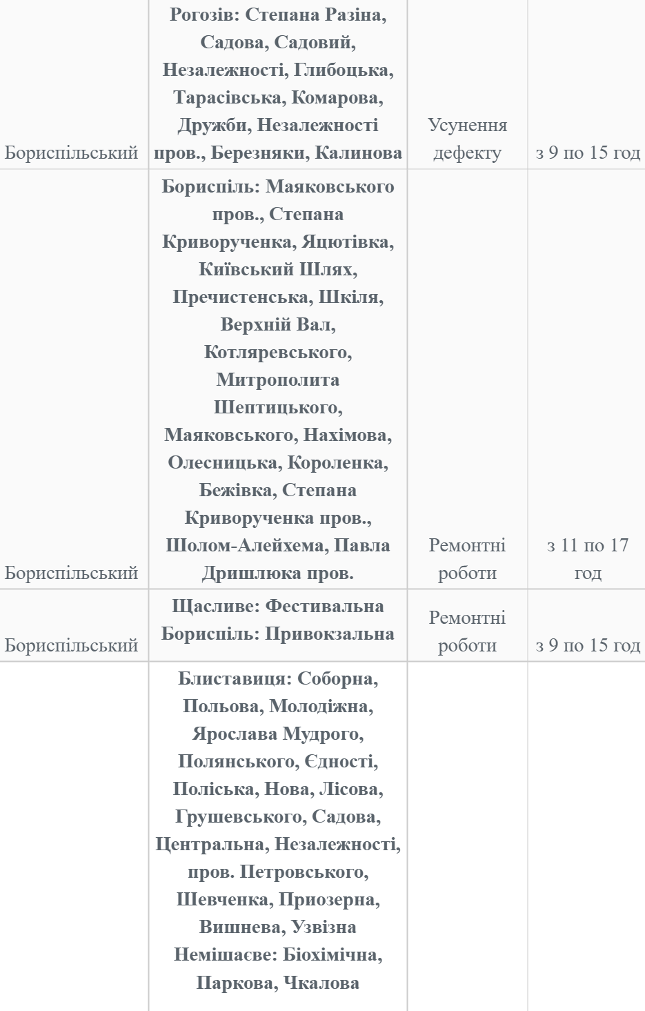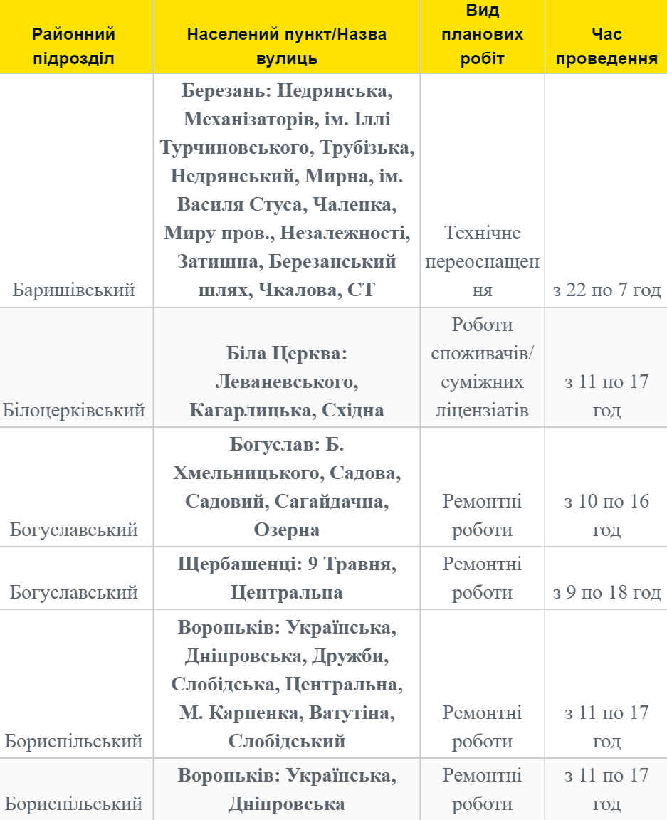 Таким чином, світла не буде в деяких будинках у Баришівському, Білоцерківському, Богуславському, Бориспільскому, Бородянському, Броварському, Васильківському, Вишгородському, Києво-Святошинському, Макаровському, Миронівському, Обуховському, Переяславі-Хмельницькому, Рокітському, Чернишському районах.