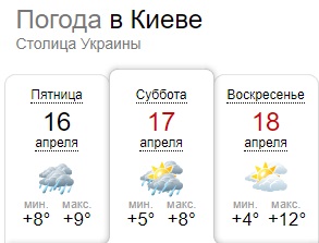 За прогнозом синоптиків, у суботу, 17 квітня, в столиці України знову очікуються дощі, але вже наступного дня з-за хмар почне виглядати сонце і температура повітря прогріється до +12 градусів.