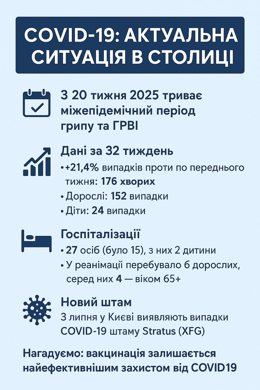 "З 20 тижня 2025 року в столиці триває міжепідемічний період грипу та ГРВІ. Проте з 30 тижня зафіксовано зростання захворюваності на COVID-19. За 32 тиждень 2025 року зареєстровано +21,4% випадків проти попереднього тижня: 176 хворих (було 145)", – повідомили у пресслужбі.