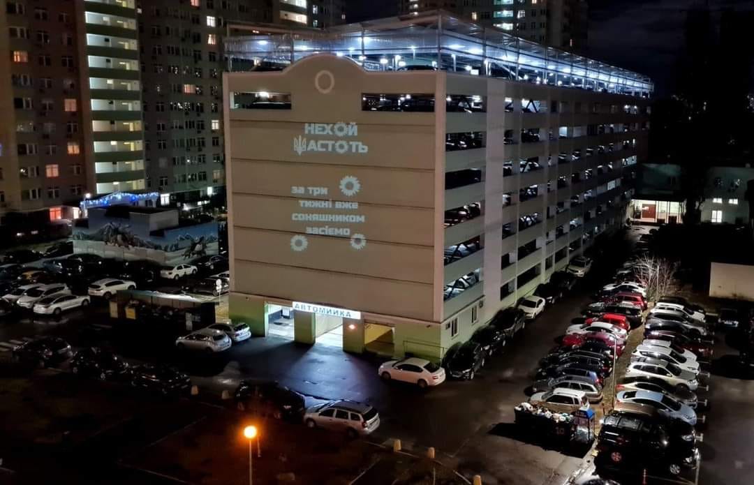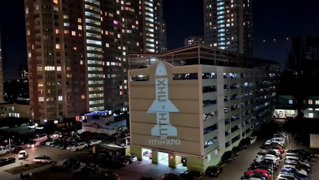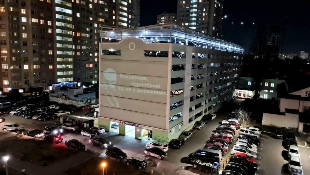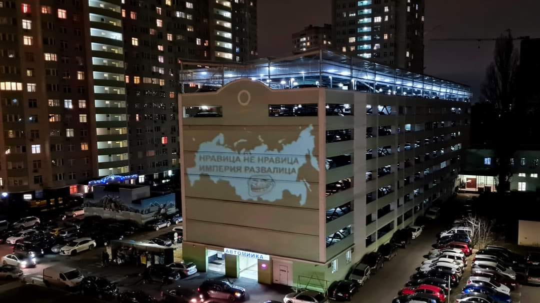 У Києві вирішили креативним шляхом підійти до написів про країну-агресора Росію, проєктуючи їх на будинок одного із столичних житлових комплексів. Щоразу картинки з написом різні.