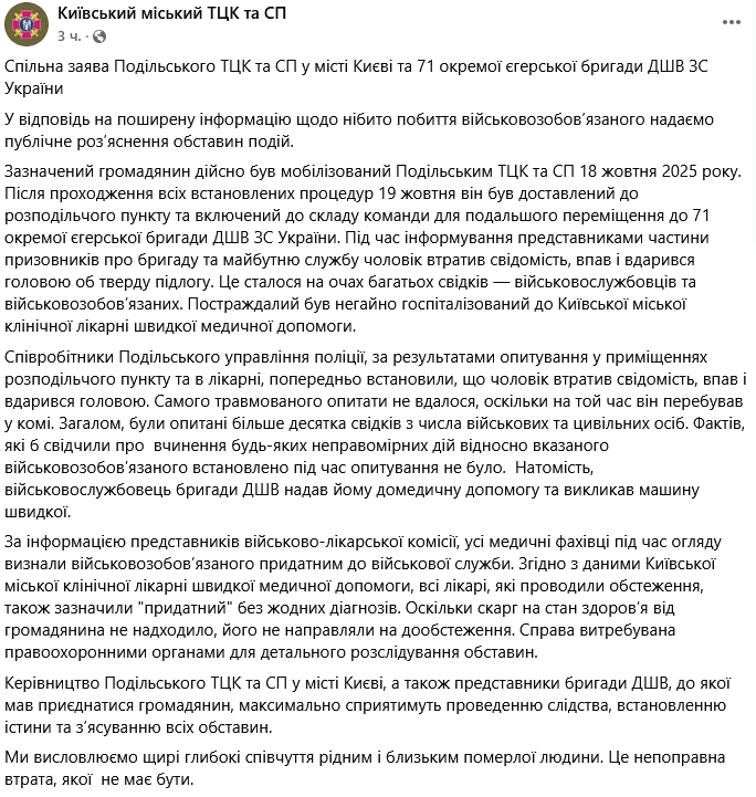 Там розповіли хронологію трагічного інциденту. Згідно із заявою, 18 жовтня Подільський ТЦК мобілізував чоловіка.