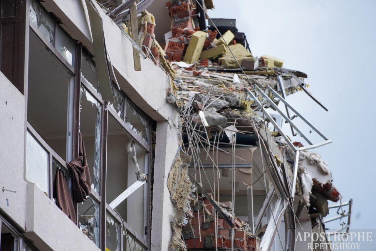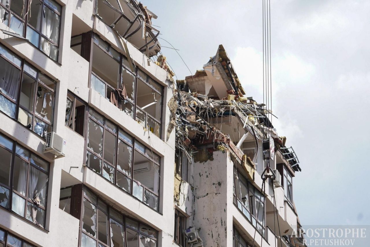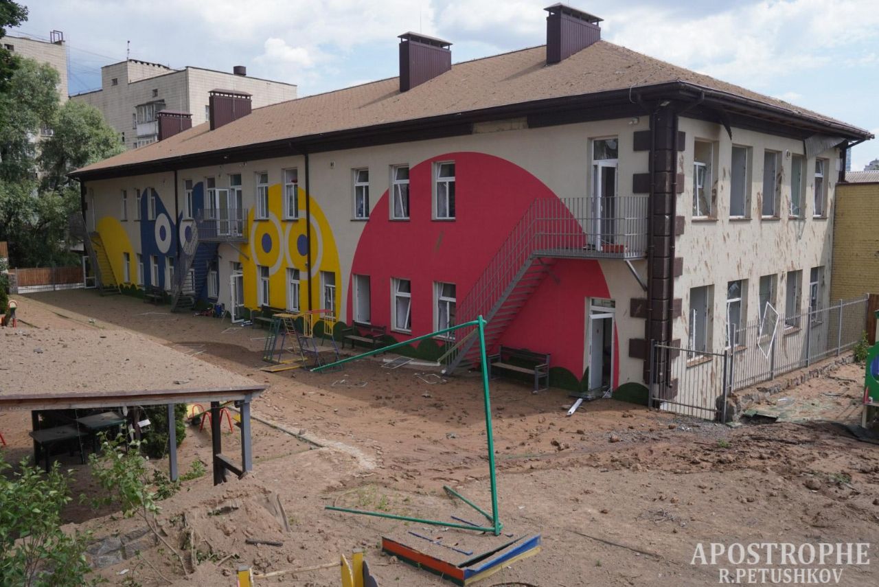 Кореспондент "Апострофа" зробив фото наслідків ворожого ракетного удару по 9-поверхівці на Татарці та по дитячому садку у центрі столиці.