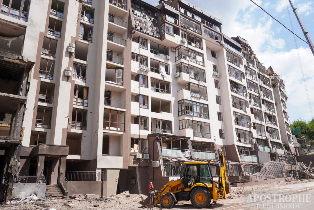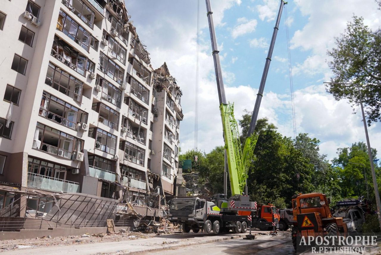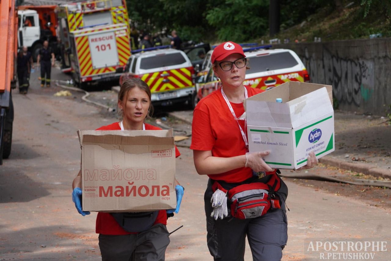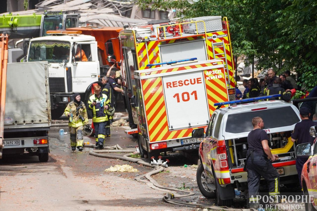 Після обстрілів російськими окупантами житлового будинку 26 червня у Шевченківському районі (Татарка) Києва оперативні служби продовжують розбирати завали. На місце події приїжджають як представники ЗМІ, так і волонтери.