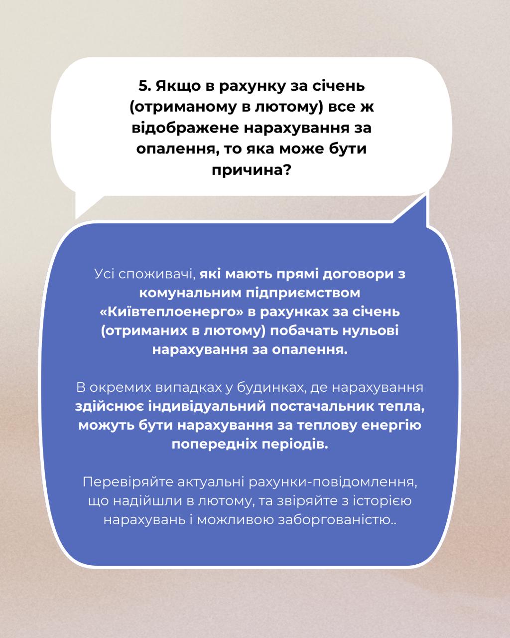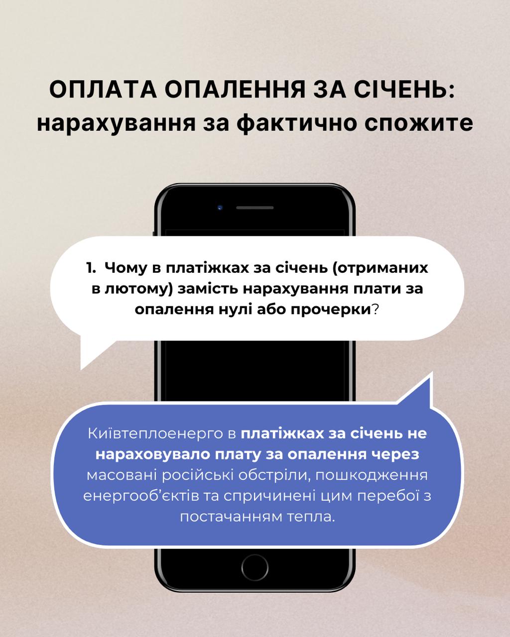 "Київтеплоенерго" не нараховувало плату за опалення в платіжках, які споживачі отримали у лютому. Плату за частину січня, коли опалення надавалося безперебійно і в повному обсязі, додадуть у платіжки за лютий, які надійдуть у березні", — йдеться у повідомленні.