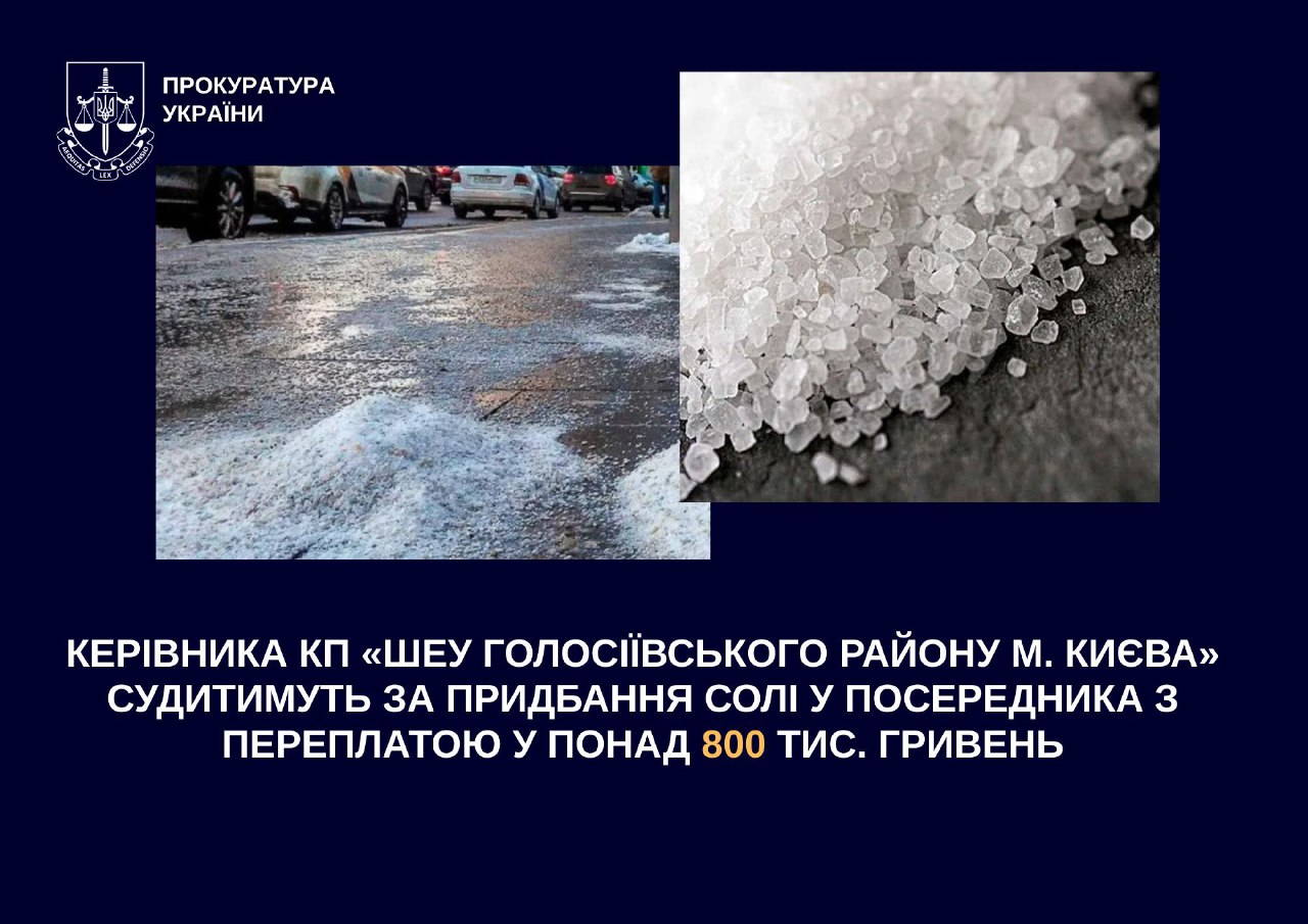 У Києві судитимуть за купівлю солі у посередника з переплатою у понад 800 тис. грн одного з посадовців комунального підприємства "Шляхово-експлуатаційне управління по ремонту та утриманню автомобільних шляхів".