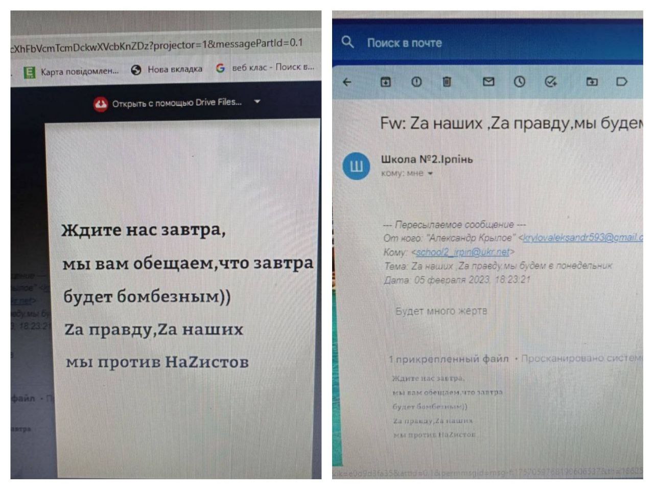 Йдеться про Ірпінський ліцей №2. Варто зазначити, що листа було відправлено на електронну пошту навчального закладу напередодні ввечері, о 18:23, проте прочитали його лише сьогодні вранці.