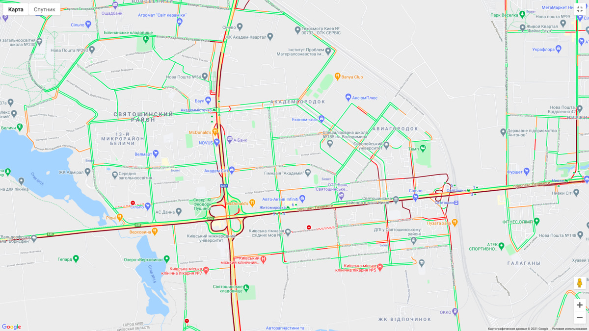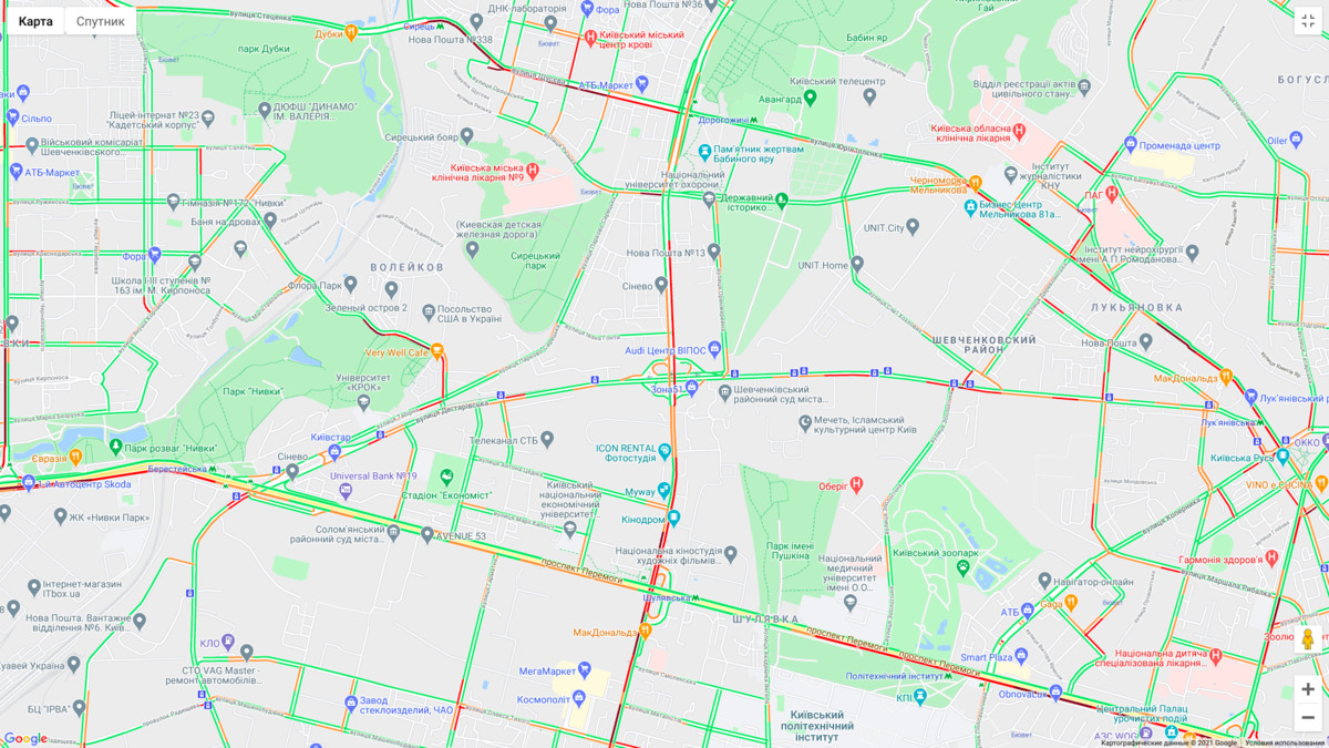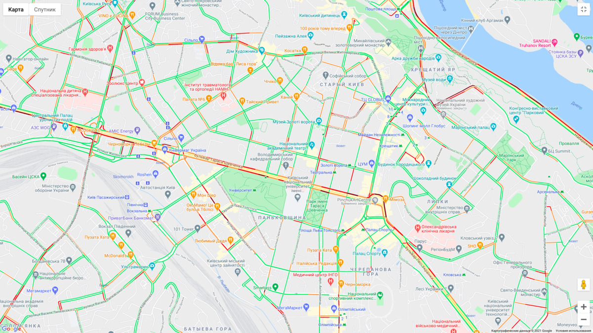 Також складно проїхати на бульварі Перова, Братиславській, Набережно-Хрещатицькій, Набережном шосе. Затори спостерігаються від метро "Славутич" до метро "Харківська".