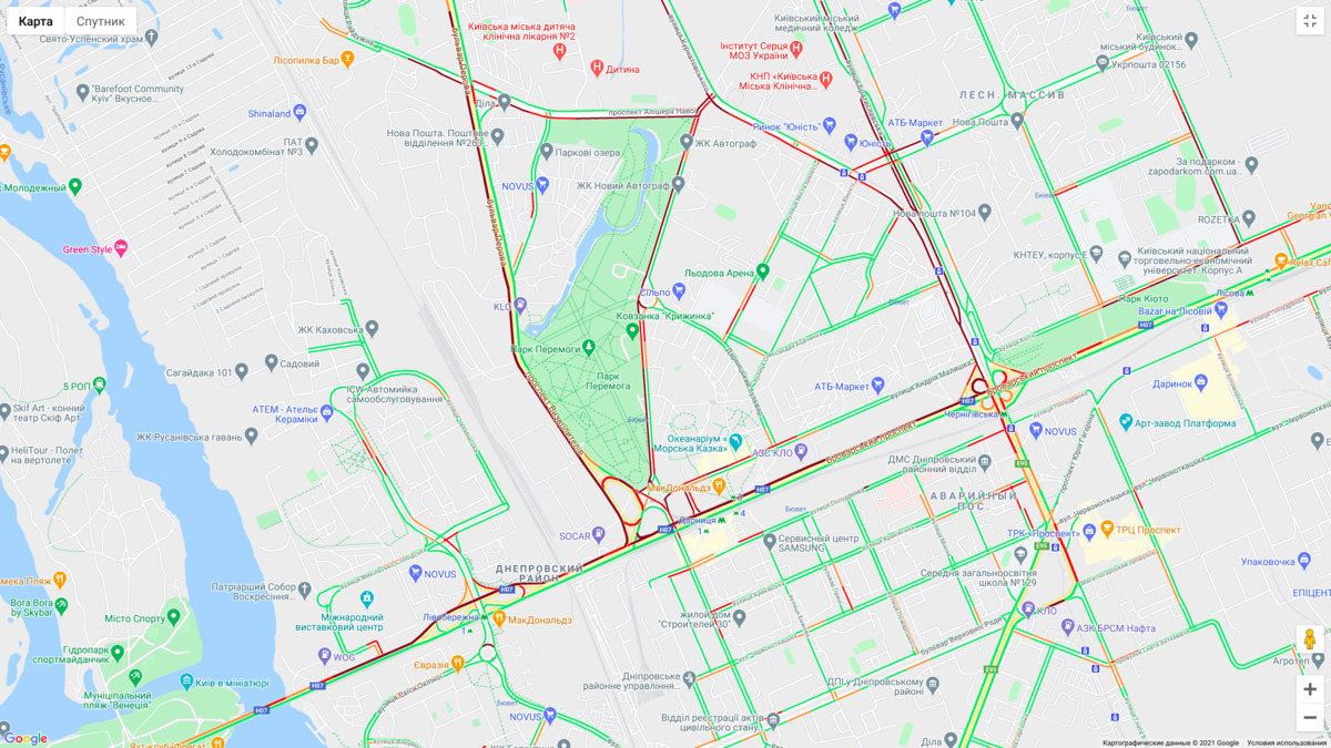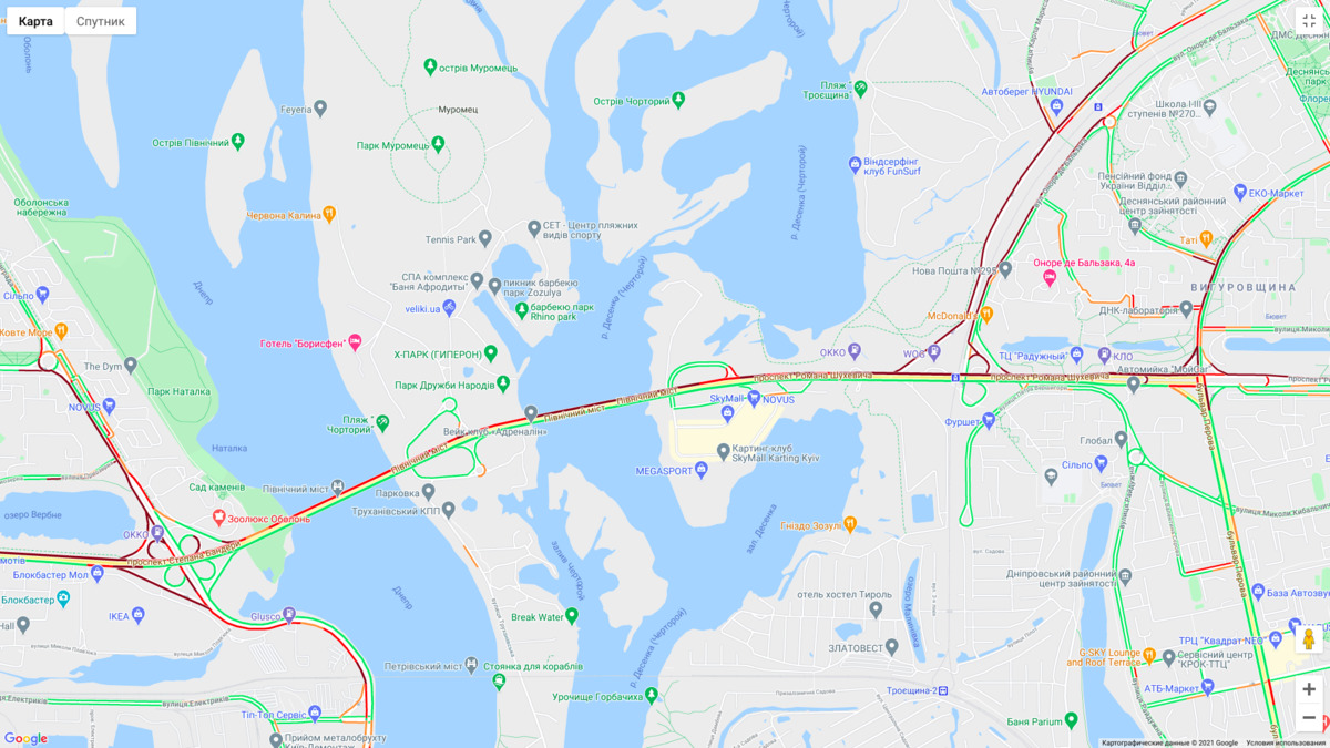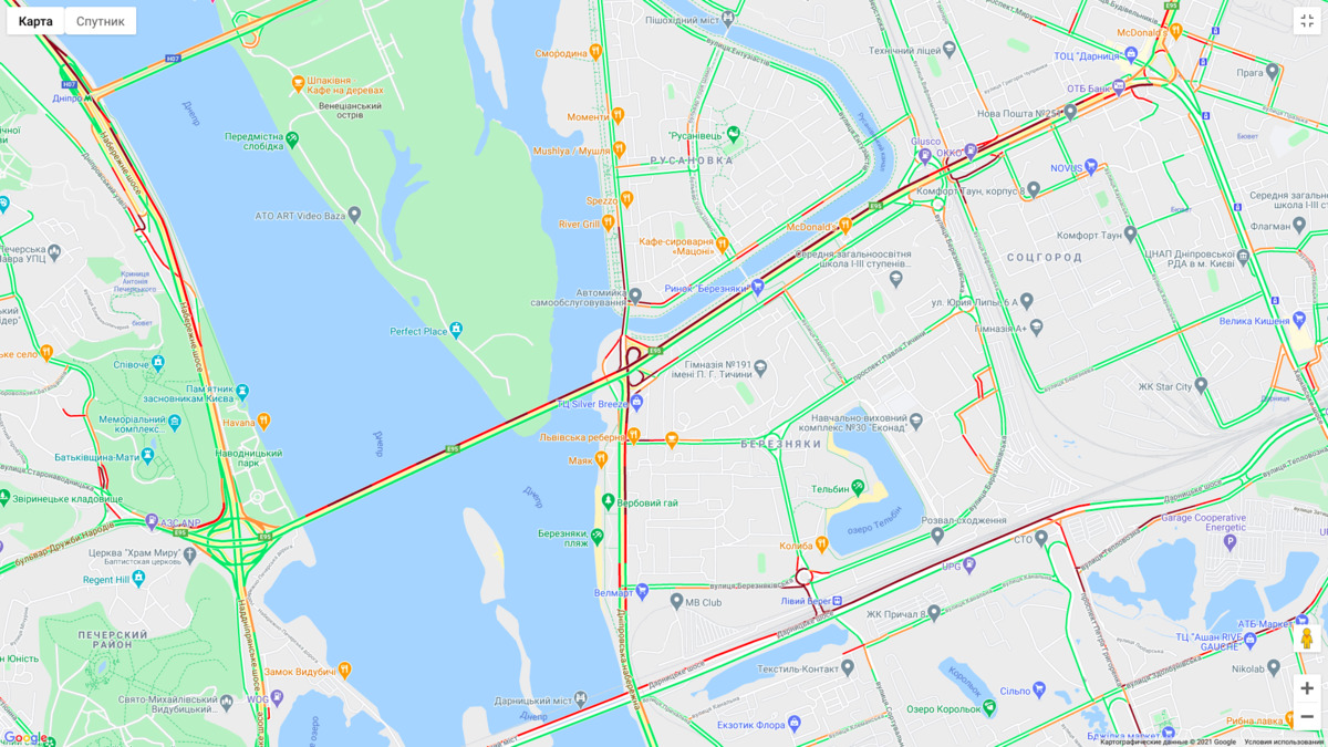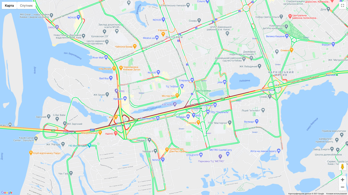 Традиційно машини стоять на мостах: пробки з двох сторін Північного моста, від моста Метро до станції метро "Лісова", на Дарницькому мосту, мосту Патона.