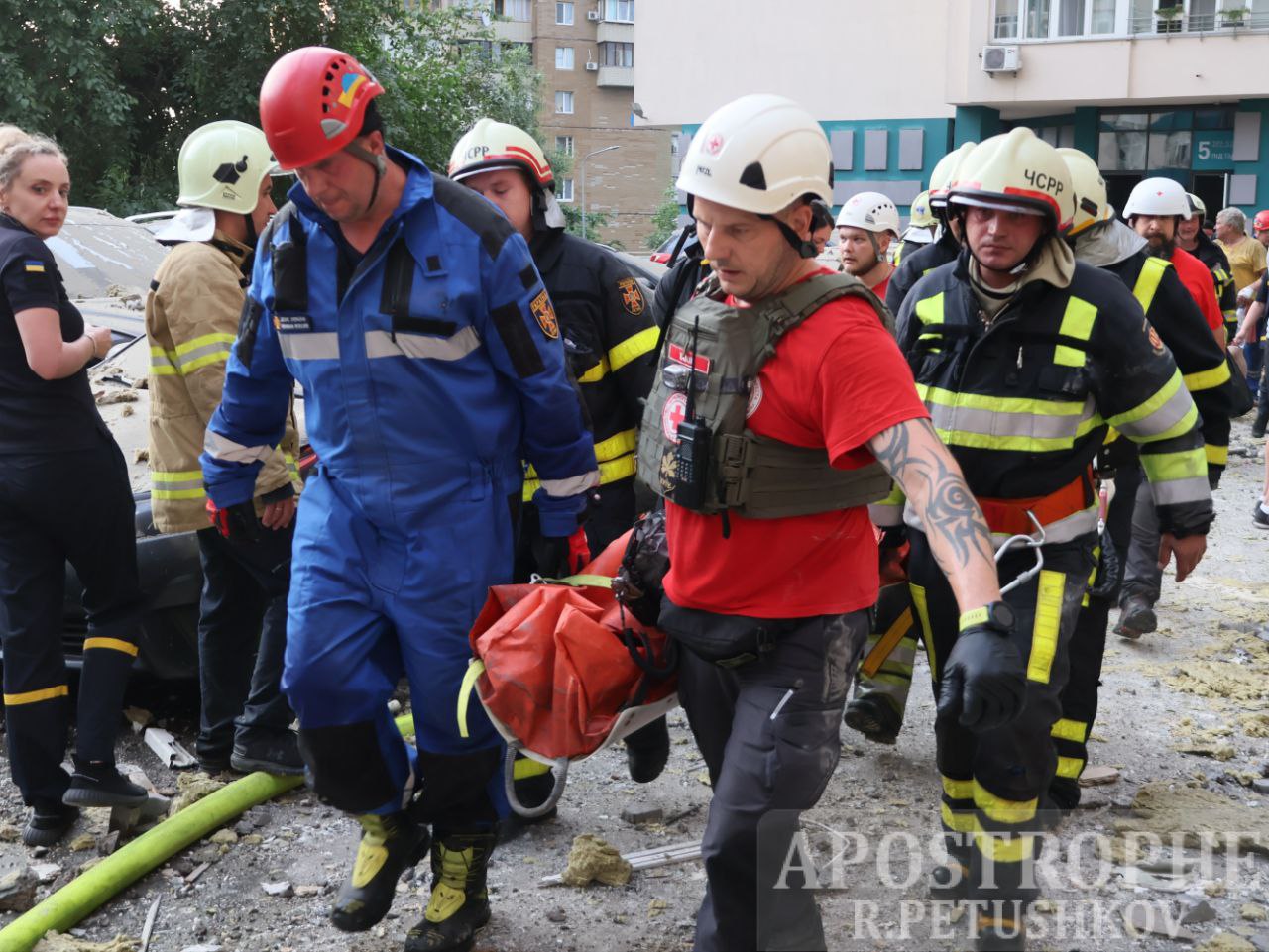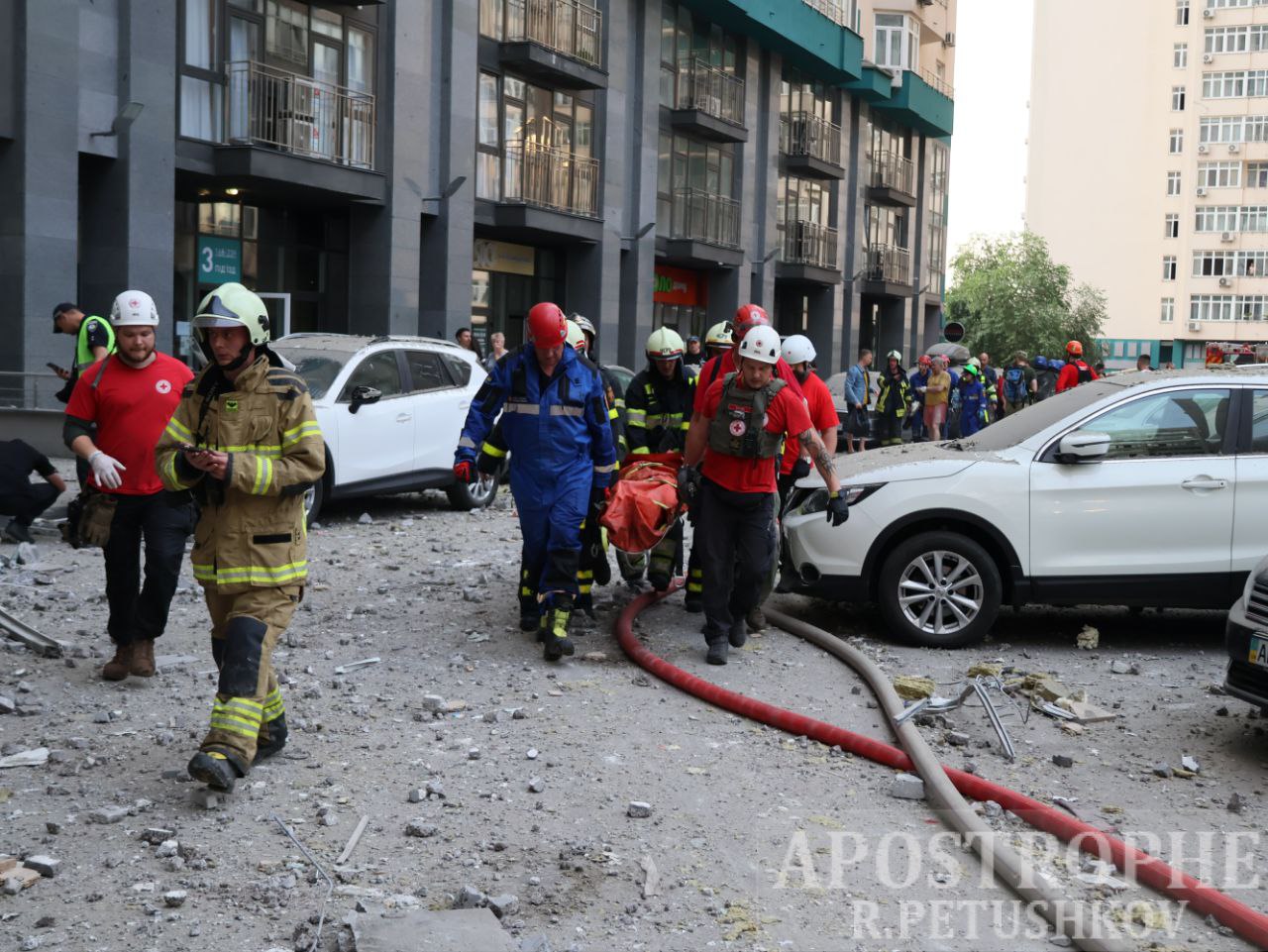 Пізніше начальник КМВА Сергій Попко уточнив, що влучання зафіксовано у 25-поверховий будинок, через що сталося часткове руйнування конструкцій на 16, 17, 18, 19 поверхах. Пожежу ліквідували о 06:30. Також керівник адміністрації зазначив, що 11 громадян отримали різні поранення.