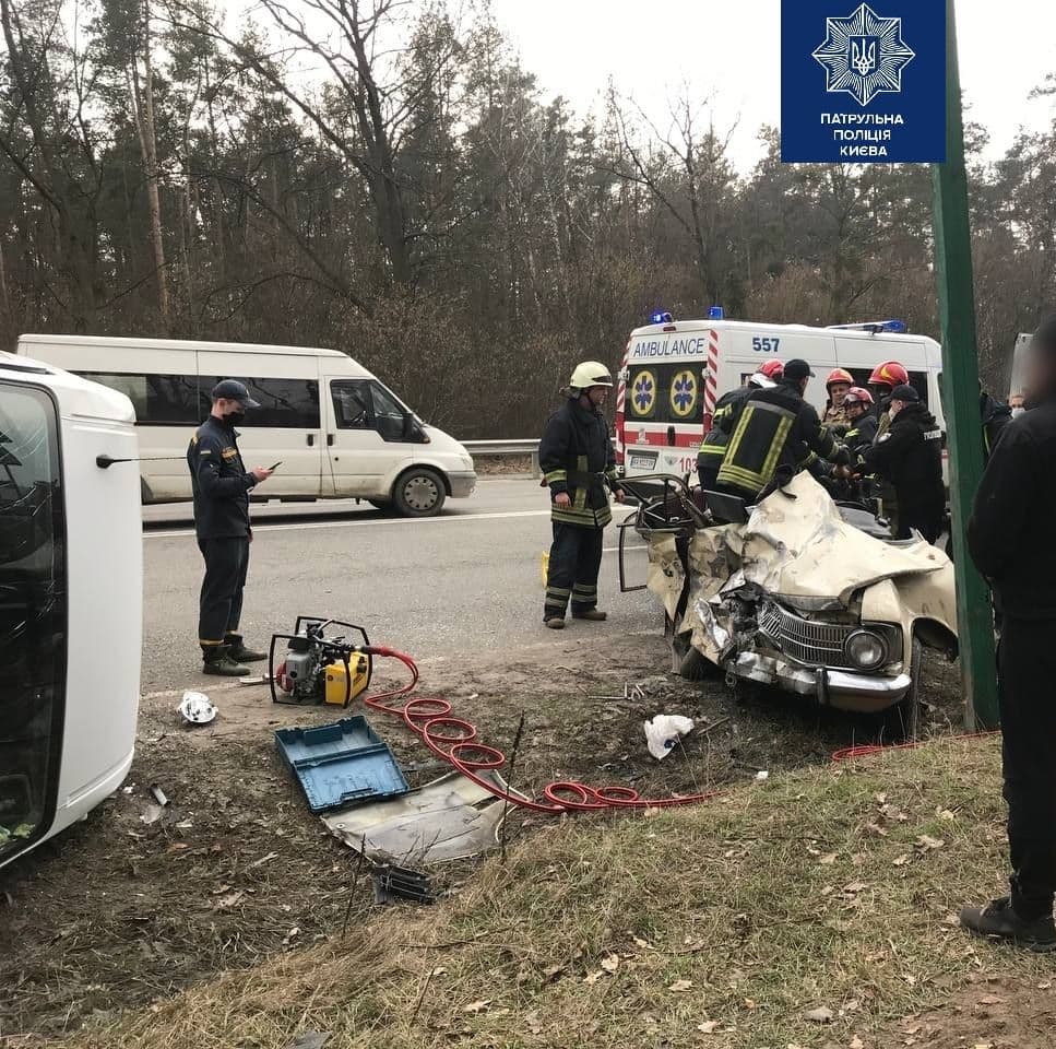 ДТП сталася перед в'їздом в місто Ірпінь. Від потужного удару мікроавтобус перевернувся на бік, передня частина легкового автомобіля розбита вщент.