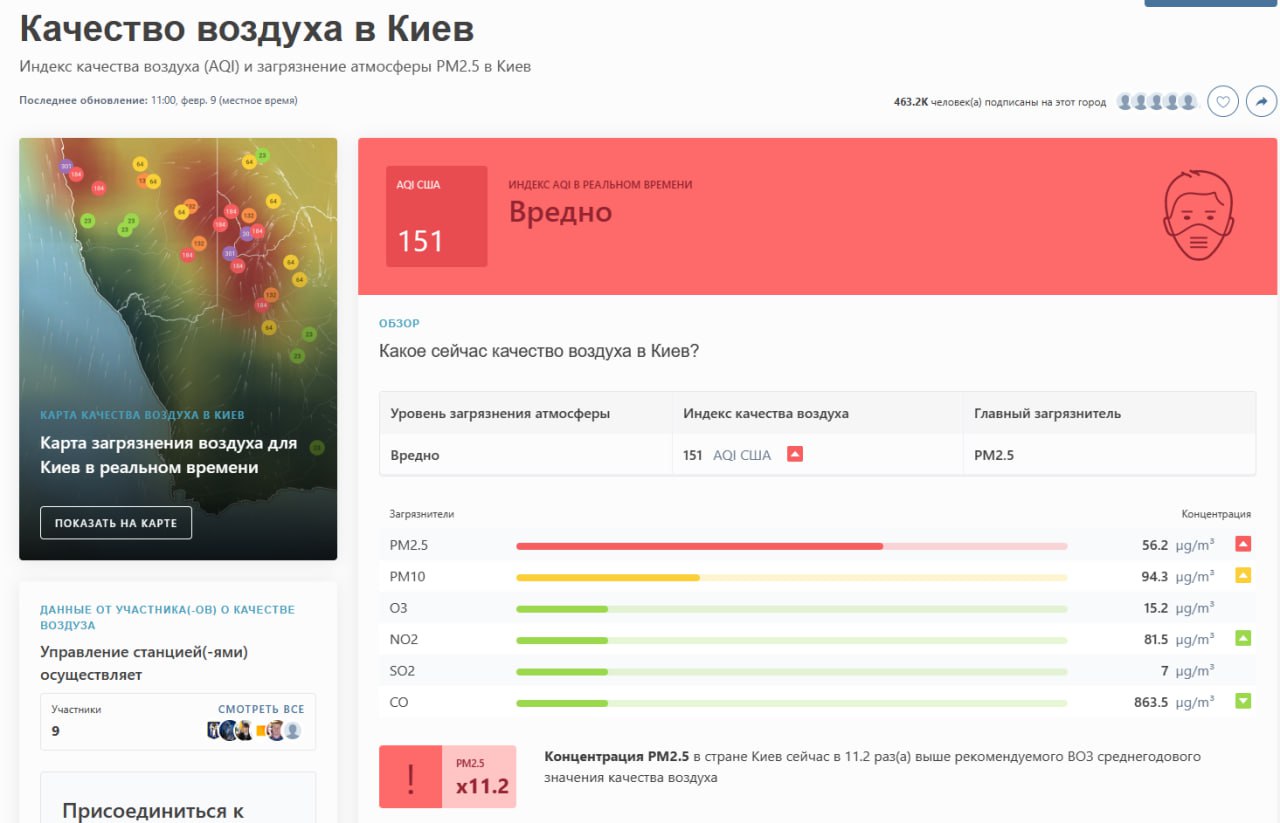 Варто зазначити, що станом на 13 годину четверга, 9 лютого, Київ опинився на 11 місці рейтингу міст із найзабрудненішим повітрям. Столиця України у 11 разів перевищує норму концентрації забруднювачів у повітрі.