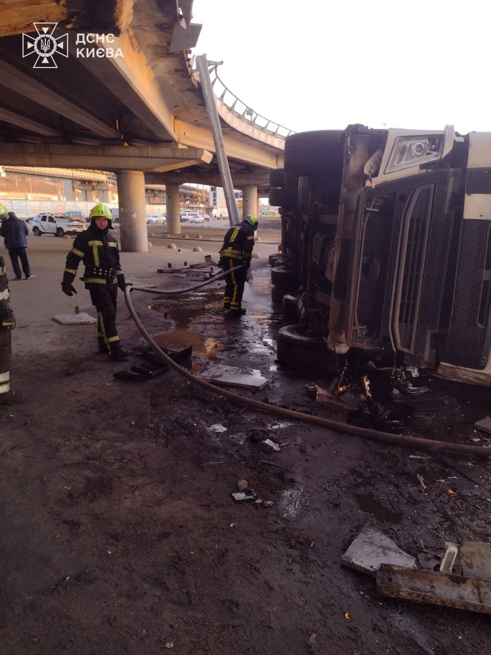 У Києві вантажівка Volvo впала з Південного мосту через погане самопочуття водія.