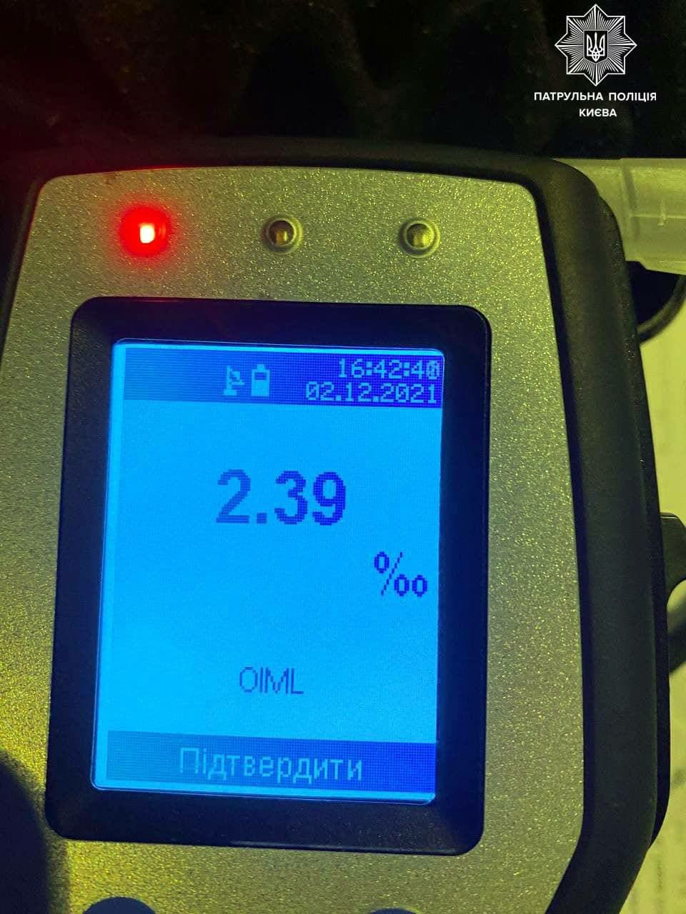 Поліцейські під час огляду машини водія побачили порожні пляшки з-під спиртних напоїв. Чоловік погодився пройти огляд стану сп'яніння за допомогою алкотесту. Результат – 2,39 проміле, що майже у 12 разів перевищує дозволену норму.