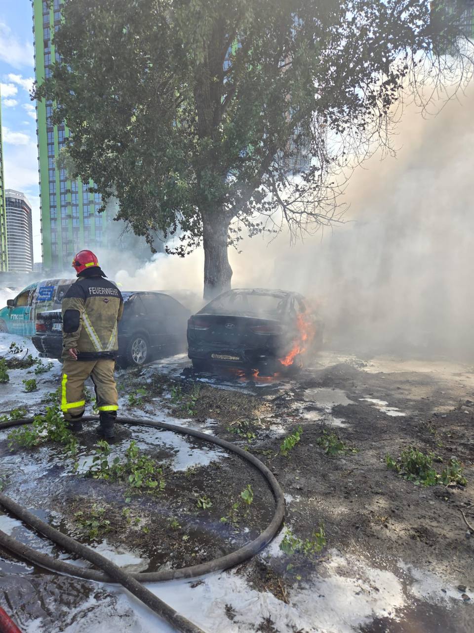 Наразі причини займання невідомі. За попередньою інформацією, зберігається загроза розповсюдження загоряння на поруч припарковані авто.