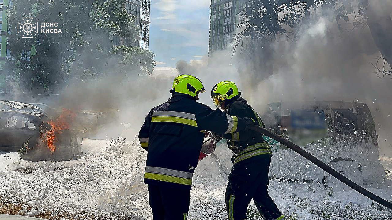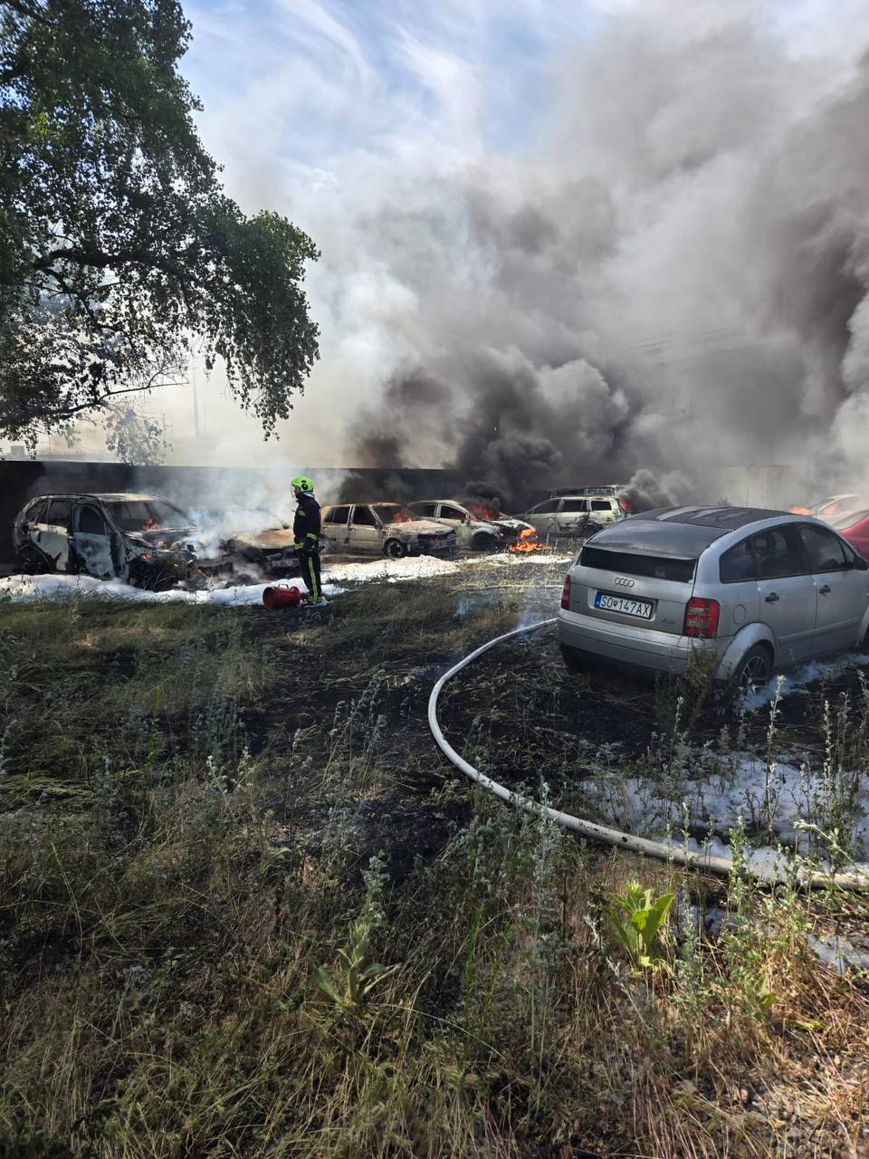 На опублікованих у мережі кадрах можна побачити велику кількість піни, якою ліквідовують пожежу, деякі автомобілі згоріли вщент – від них залишився лише каркас. З місця пожежі валить густий сірий дим.