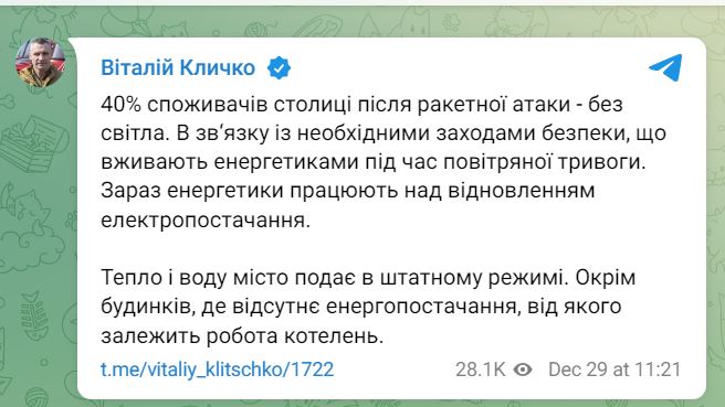 Мер Києва віталій Кличко повідомив, що 40% споживачів столиці після ракетної атаки - без світла.