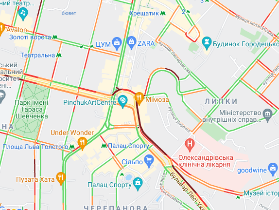 За словами водіїв, утворилася пробка у бік Бессарабської площі. Як свідчать дані сайту Infoportal.kiev, станом на 10:30 ранку п'ятниці, 6 серпня, ускладнений транспортний рух на вул. Басейна, Бессарабській площі та Крутому узвозі.